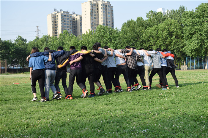 我们的女同学也不甘示弱,与男生一块肩搭肩,团结一致,脚踏实地往前走。同学们努力拼搏,我们的辅导员老师亲自指导,和同学们一起融入到活动中。