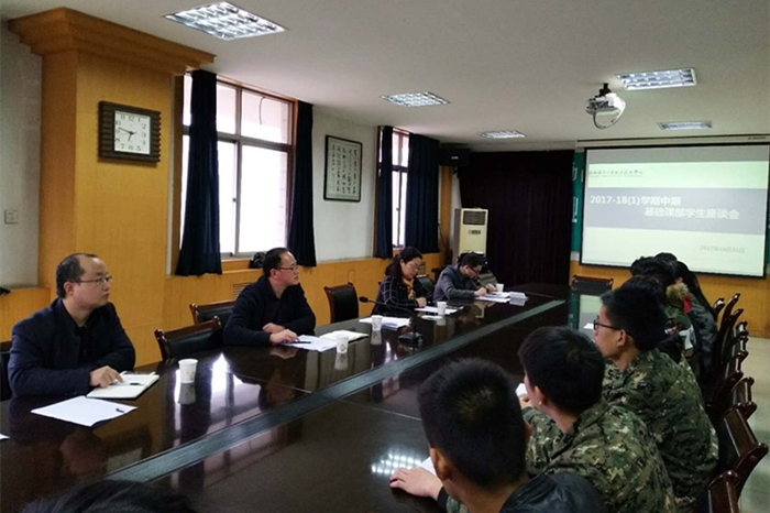 2017年10月31日下午,基础课部在南区信息楼会议室召开了2017—2018学年度第一学期中期学生代表座谈会,基础课部主任杨文革、总支书记吴玮玮、数理教研室主任杨爱云、语言教研室主任曹李宏、基础课部相关教学管理人员及516级、517级学生代表26人参加了座谈会。