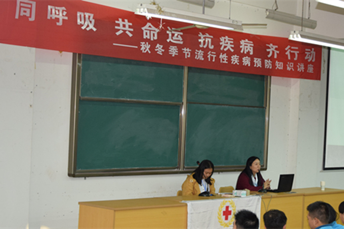2017年11月7日16时10分,以“同呼吸 共命运 抗疾病 齐行动”为主题的秋冬季节流行性疾病预防知识讲座于我校教三233教室顺利召开。院团委志协部——校园红十字救护队邀请医务室主任杨柳出席本次讲座。参加本次活动的有校园红十字救护队17级成员、院团委17级见习委员以及各系17级的学生代表。