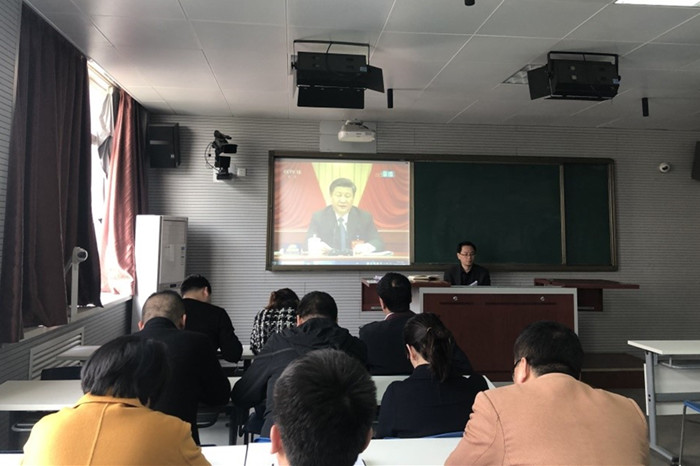 第一阶段,教学管理党总支书记张俊勇带领全体教职工进行政治理论学习,观看《两会进行时》视频,解读了2019年政府工作报告,学习了全省教育大会精神、学校创建省教育系统“文明校园”动员部署会议精神和扫黑除恶专项整治行动方案相关文件内容。