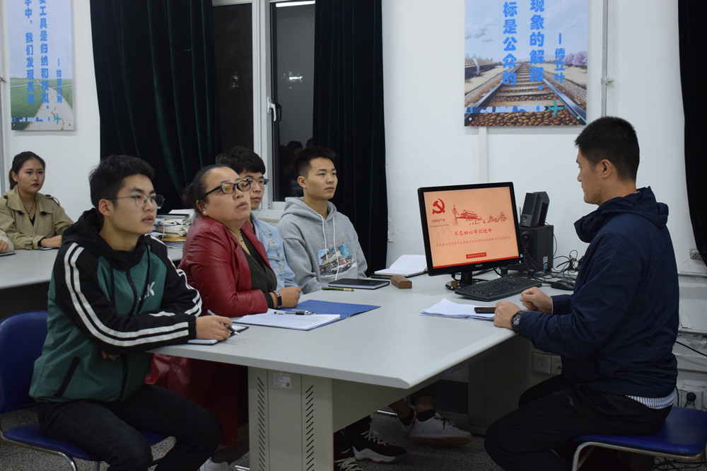 10月10日晚,基础课学生党支部在南校区教学三楼205会议室开展“不忘初心、牢记使命”主题教育专题党课活动。党课由基础课学生党支部书记杨论主讲,学生支部委员刘娟老师、余腾飞老师以及全体学生支部党员、预备党员参加。