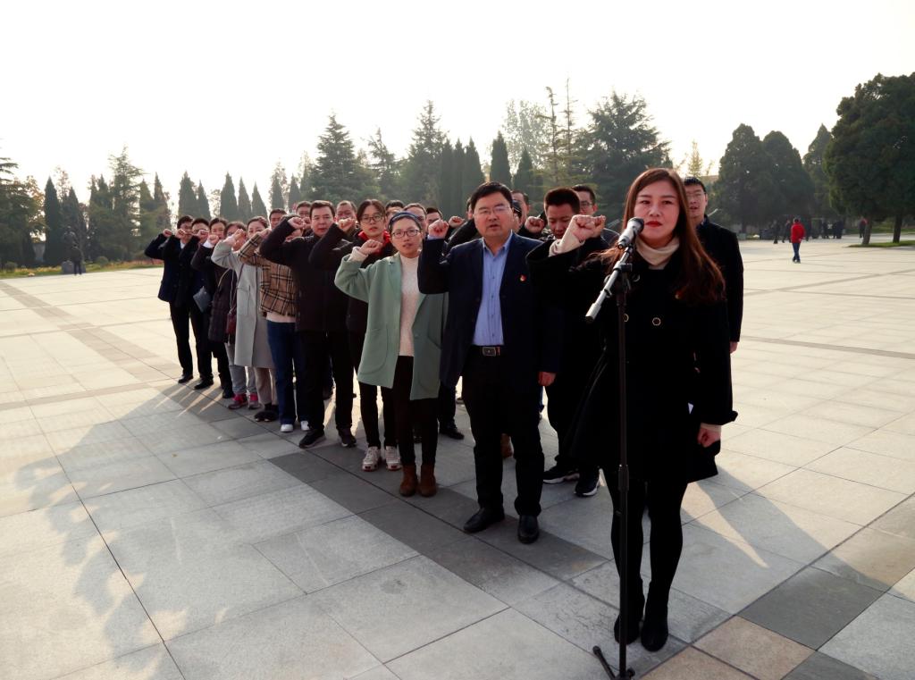 在扶眉战役纪念碑前,全体党员高唱中华人民共和国国歌,为革命烈士敬献花篮,王明哲书记为花篮整理缎带,同志们默哀致敬。在艺术学院直属党支部副书记管阳的带领下,全体党员面向党旗,举起右拳,表情凝重,声音洪亮重温入党誓词,表达对革命先烈的深切缅怀和崇高敬意。