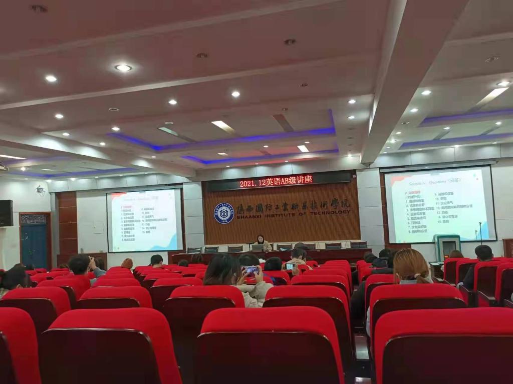 为帮助我校学生有效应对高等学校英语应用能力AB级考试,2021年12月15日下午4点30分,由基础课部举办的英语AB级考前讲座在北区教二报告厅进行。主讲人刘冰尧老师教学经验丰富,多次参加陕西省AB级阅卷工作,对AB级考试有深入研究,讲座内容针对性强。由于疫情防控要求,本次讲座采用线上线下相结合的方式开展,现场45名学生参加了此次讲座,整个讲座过程中,同学们聚精会神,专心致志,边听边记边拍,掌握了讲座的核心内容。