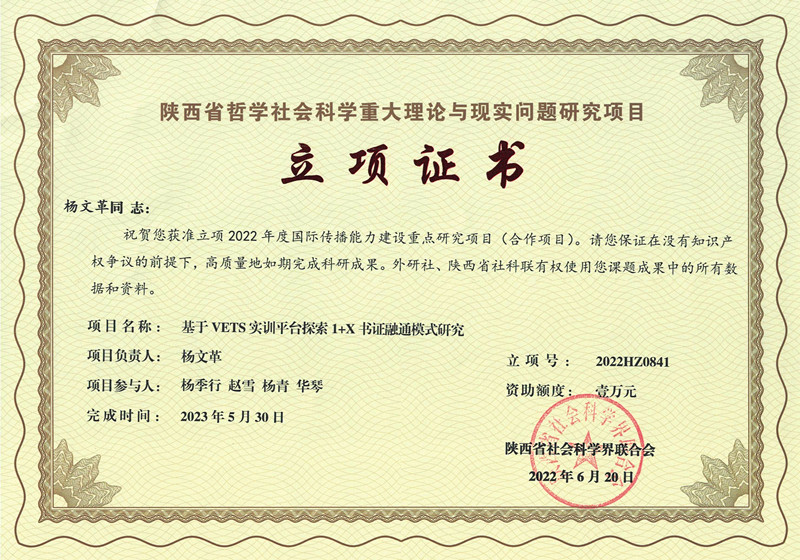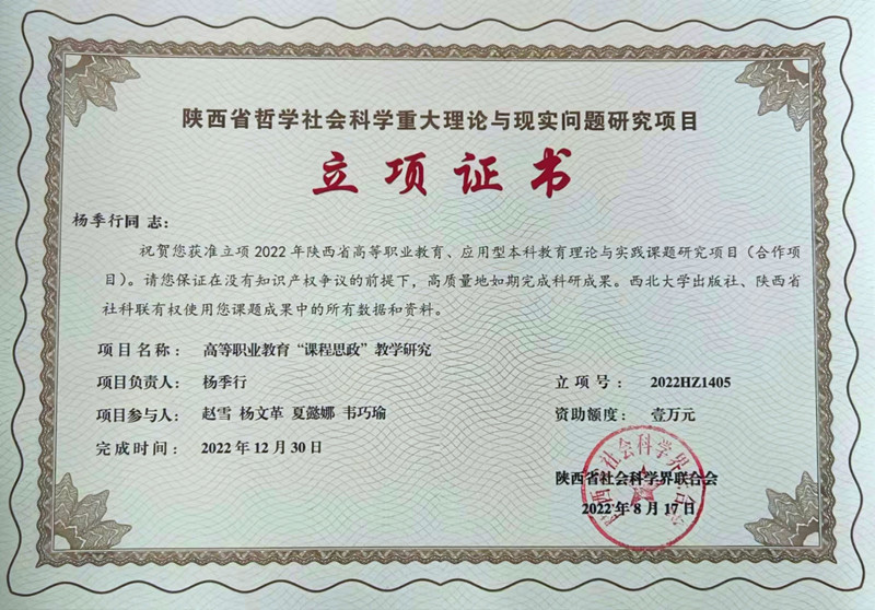 近日,陕西省社会科学界联合会发布《关于公布2022年度国家传播能力建设重点研究项目立项结果的通知》(陕社科联〔2022〕65号)和《关于公布2022年陕西省高等职业教育、应用型本科教育理论与实践课题研究项目立项结果的通知》(陕社科联〔2022〕94号)。基础课部教师杨文革老师申报的《基于VETS实训平台探索1+X书证融通模式研究》课题、杨季行老师申请的《高等职业教育“课程思政”教学研究》课题和赵兹老师申请的《高等院校经济数学课程思政教学与教材建设研究》课题获批立项。