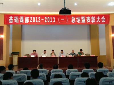 4月17日下午,基础课部在南区学术报告厅召开2012-2013学年第一学期总结暨表彰大会, 2012级全体学生参加了大会。基础课部主任成均孝、党支部书记王广林、半军事化管理教官、办公室工作人员及全体辅导员出席了大会。大会由学生干事赵刚主持。