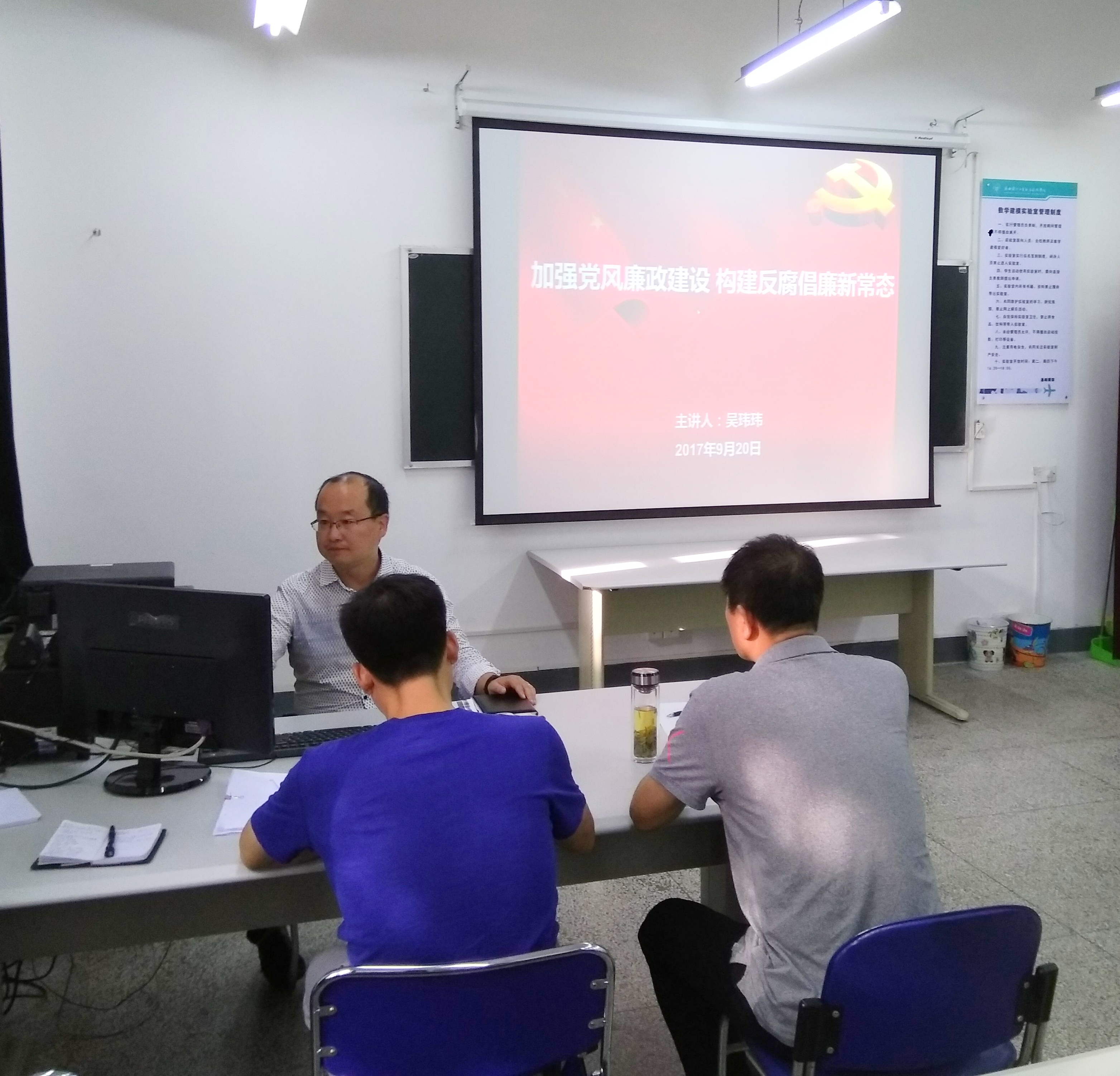9月20下午,基础课党总支书记吴玮玮在南校区教学三楼205会议室为基础课党总支全体党员上党风廉政建设和反腐倡廉专题党课。出席会议的有基础课部主任杨文革、体育部部长王茂利以及基础课全体党员同志。
