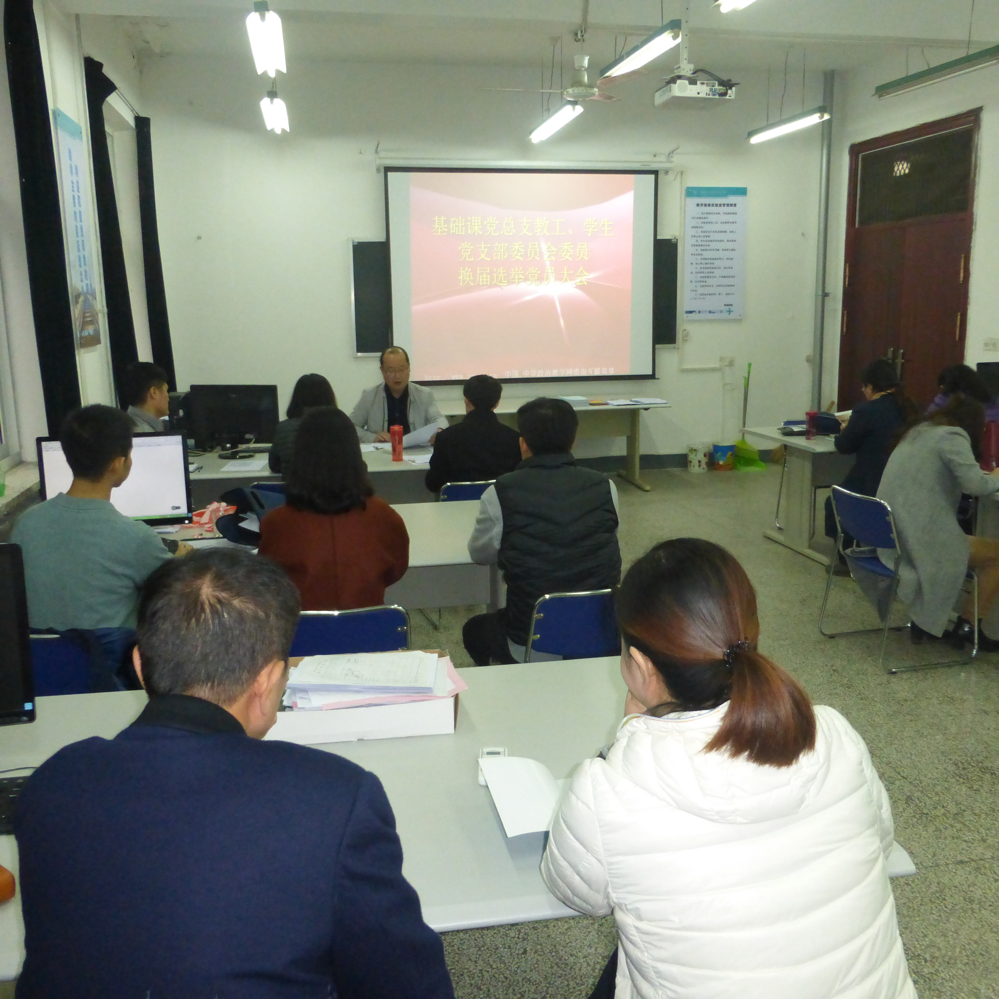 10月17日下午,基础课党总支书记吴玮玮同志在南区教学二楼205室主持召开基础课部党总支教工、学生党支部委员会委员换届选举工作。大会实到党员人数23人,正式党员22人,预备党员1人,符合投票选举人数要求。