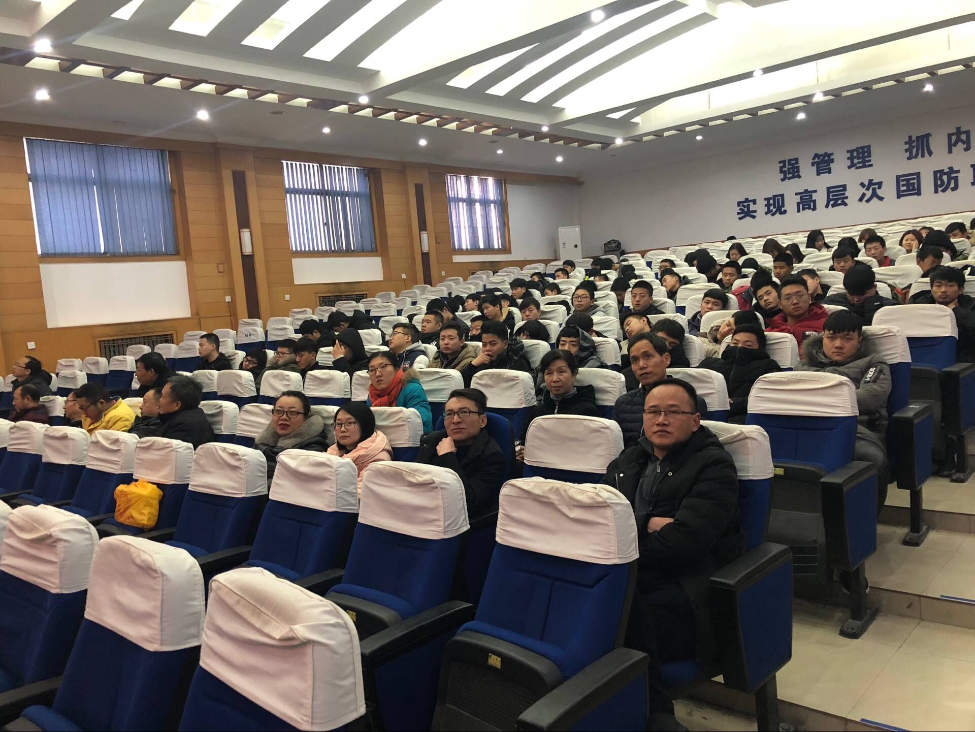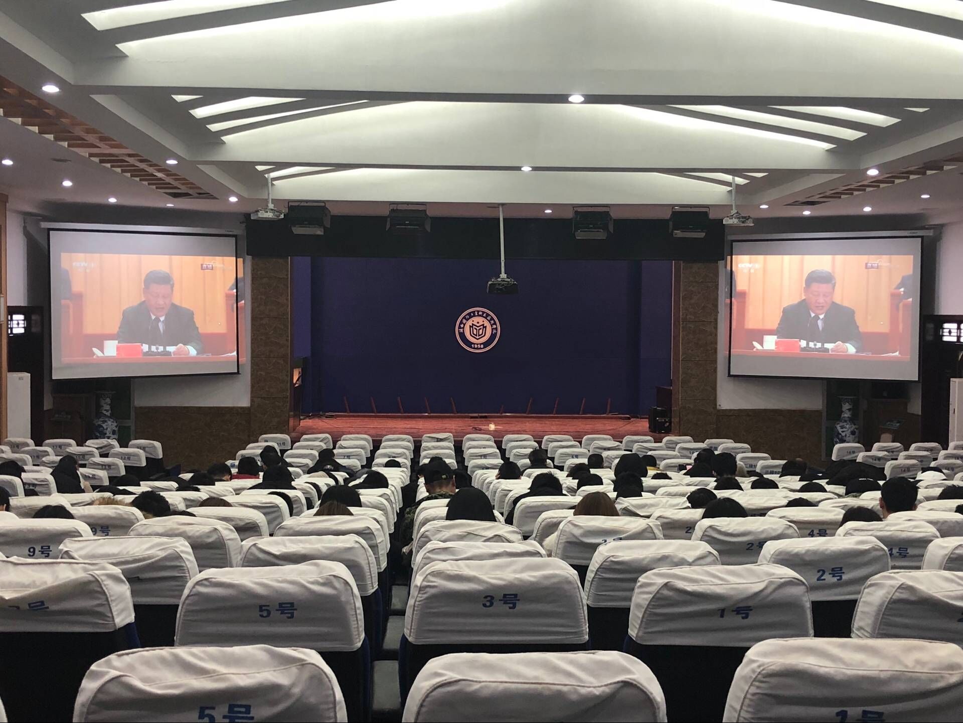 基础课部广大师生在南区报告厅观看大会直播,当《中华人民共和国国歌》响起,基础课部师生起立,表达对祖国的崇敬之情。