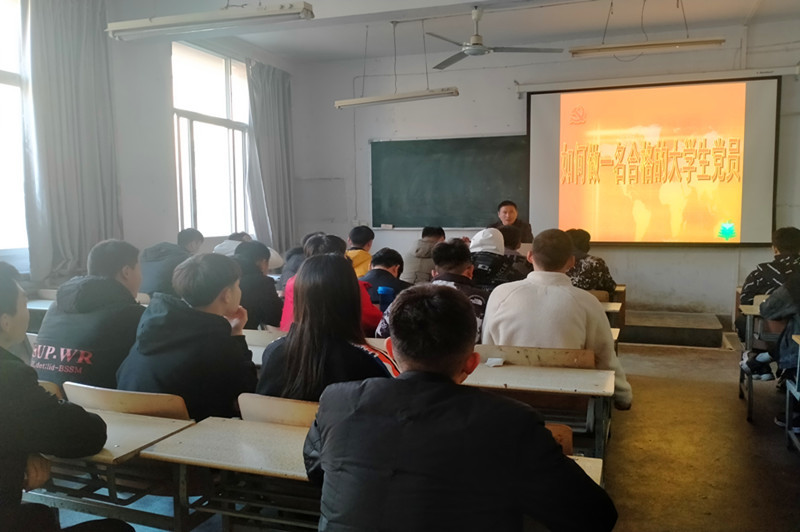 2021年11月24日下午,基础课党总支书记权华为学生讲党课,基础课部518级积极分子、团员、学生会成员参加党课学习。权华以《如何做一名合格的大学生党员》为主题,从先锋模范作用和日常标准要求展开讲述,并向大家提出三点要求:第一,要提高自己的学习能力;第二,要加强党性修养,要学会用自己的头脑来思考问题;第三,不断提高个人理论水平。