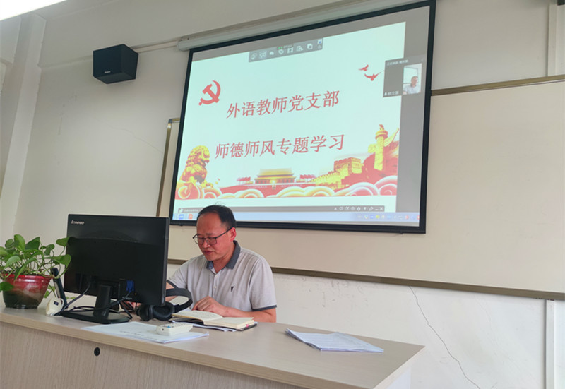 2022年5月6日下午,基础课党总支外语教师党支部开展师德师风专题学习,学习教育活动由基础课党总支副书记、外语教师党支部书记杨文革同志主持,外语教师党支部全体党员及2022年度基层党建创新《后疫情时代师德师风建设中如何发挥教师党支部的战斗堡垒作用》项目组全体成员参与此次活动。