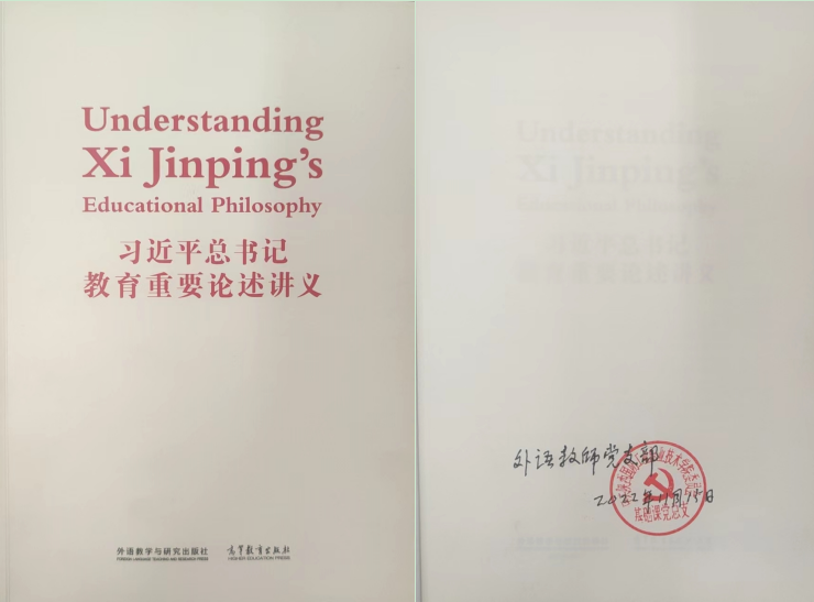 本次为全体党员购买了《习近平总书记教育重要论述讲义中英文版书籍,发放到每一位党员手中本书共包含九讲,一讲坚持党对教育事业的全面领导;二讲坚持把立德树人作为根本任务;三讲坚持优先发展教育事业;四讲坚持社会主义办学方向;五讲坚持扎根中国大地办教育;六讲坚持以人民为中心发展教育;七讲坚持深化教育改革创新;八讲坚持把服务中华民族伟大复兴作为教育的重要使命;九讲坚持把教师队伍建设作为基础工作。习近平总书记教育重要论述”是习近平新时代中国特色社会主义思想的重要组成部分,标志着我们党对教育规律的认识达到了新高度,为新时代教育改革发展提供了根本遵循。