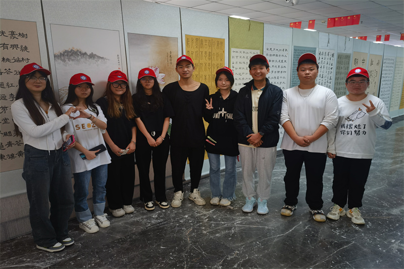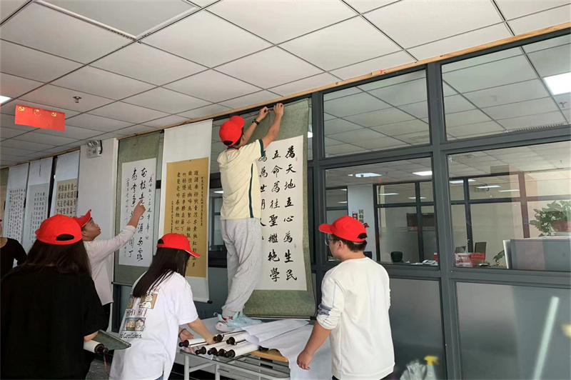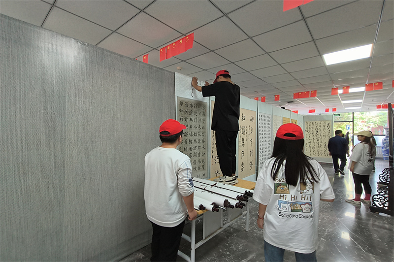协助工作人员布置书画展场地。志愿者相互配合、分工明确,将桌椅、花盆按工作人员的要求摆放到正确位置,在其负责人的带领下,志愿者分为两组,快速高效地将近百余副大大小小的书画小心地悬挂,得到了负责人的表扬与认可。志愿者干劲十足,相互协作,最终将自己的任务全部完成,有效地发扬志愿服务精神,展现了新时代青年的积极风貌。