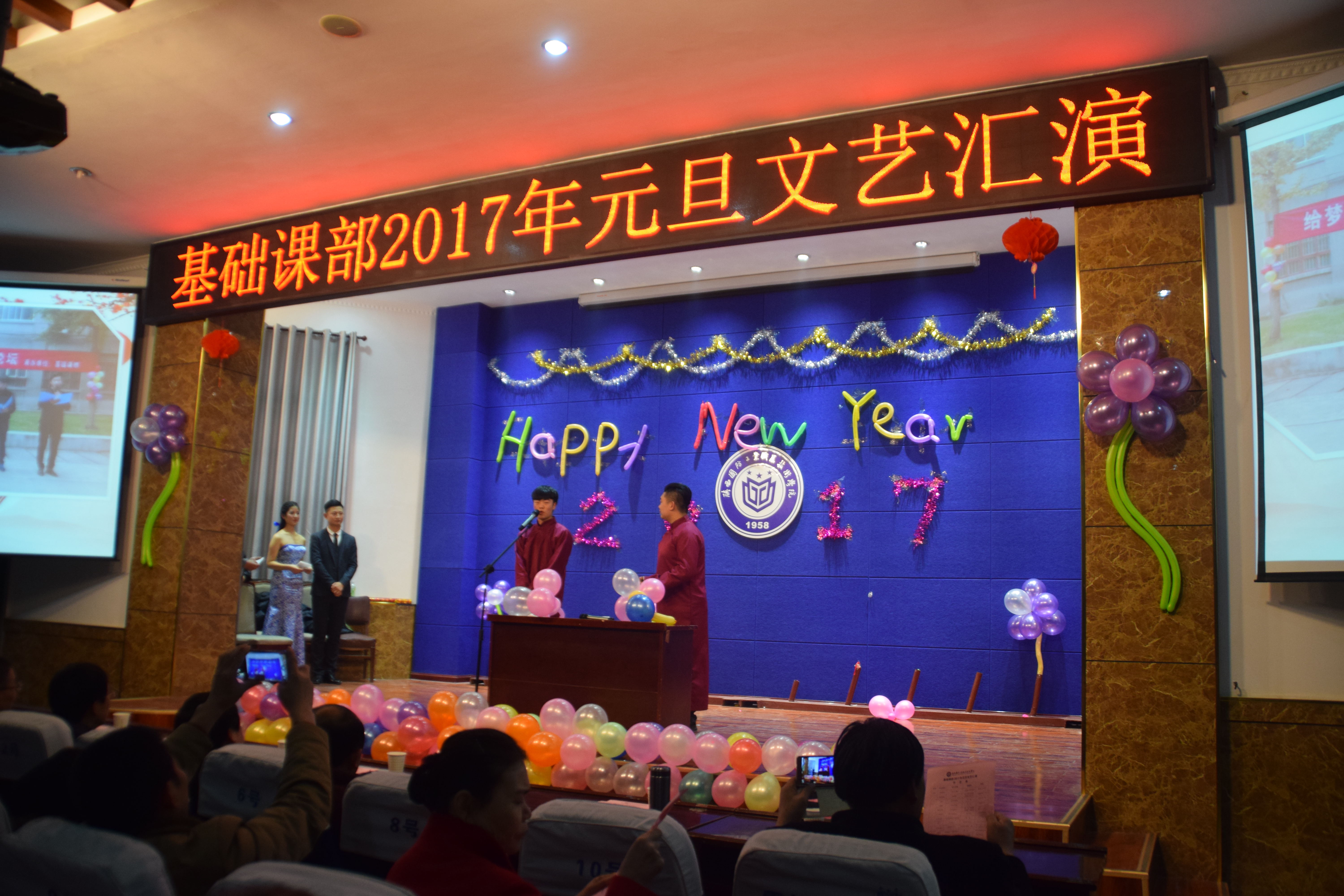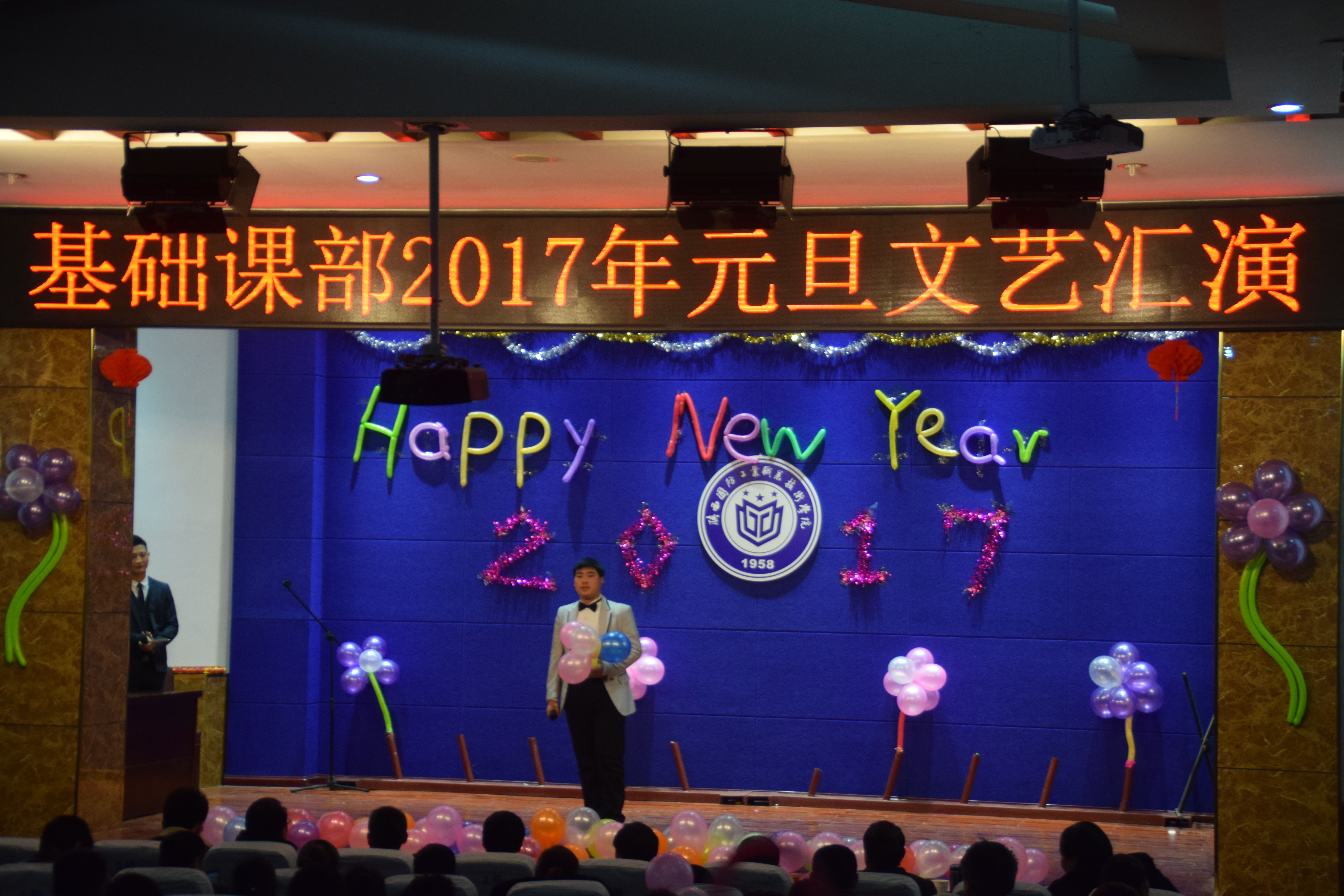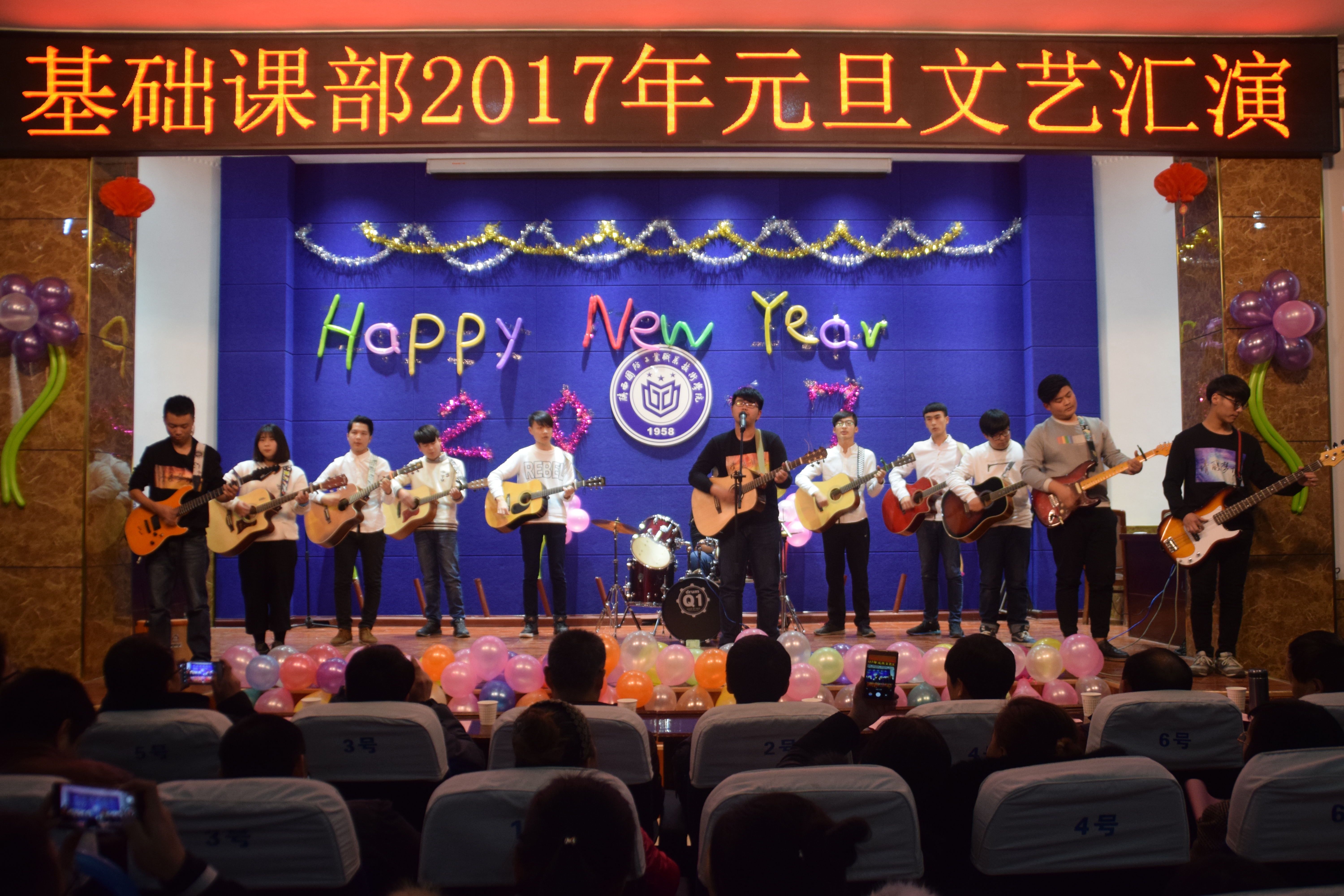 基础课党总支书记杨文革老师首先为汇演致辞,他对我部师生2016年的共同努力诚挚感谢,对即将到来的2017年作出新的展望,祝福广大师生新年快乐。随后一首充满青春活力的乐队演奏拉开了汇演的帷幕。