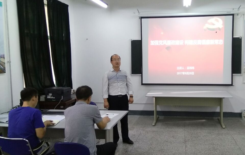 9月20下午,基础课党总支书记吴玮玮在南校区教学三楼205会议室为基础课党总支全体党员上党风廉政建设和反腐倡廉专题党课。出席会议的有基础课部主任杨文革、体育部部长王茂利、学生科科长杨论以及基础课全体党员。