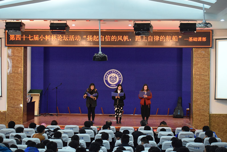 如果把人生比作漫漫航程,那么人就是一条条船,而自信就是船的动力。自信是一个人前进的动力,是一个人成功的必要条件,因此,我们要扬起自信的风帆,这样才能到达成功的彼岸。2019年12月10日下午在南校区报告厅,基础课部以“扬起自信的风帆,踏上自律的航船”举办第47期小树林论坛活动。