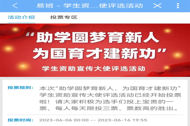 根据《省教育厅关于开展2023年高校资助育人主题活动通知》的要求,为大力拓展资助育人新路径,推动学生资助由“保障型”向“发展型”延伸拓展,为大力宣传国家资助政策及成效,提升资助育人实效,激励广大受助学生奋发自强、立志成才、感恩回馈、为国奉献,由校资助中心发起,基础课部承办,校易班工作站协办,开展以“助学圆梦育新人,为国育才建新功”为主题的学生资助宣传大使评选活动。