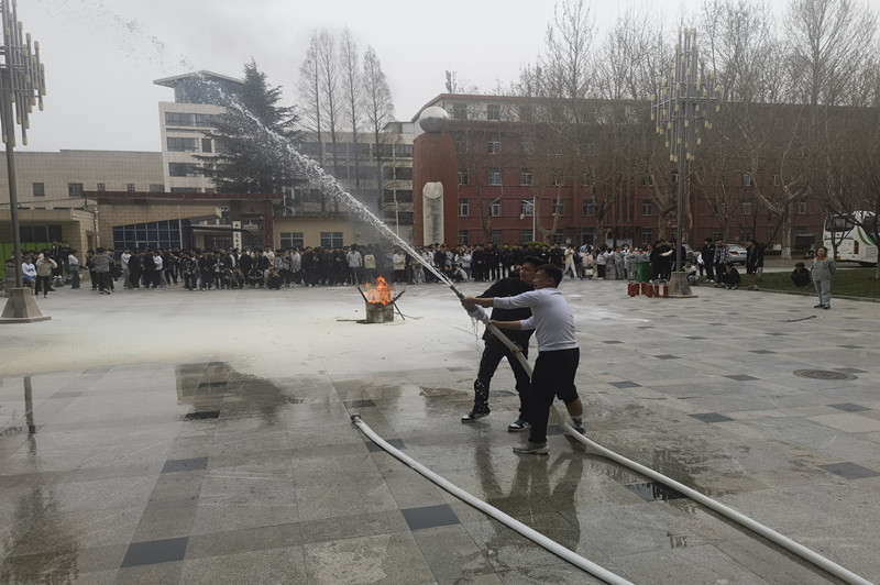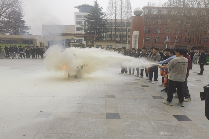 疏散逃生演练结束后,进行了现场消防灭火演练,消防员向全校师生讲解并演示灭火器的使用。