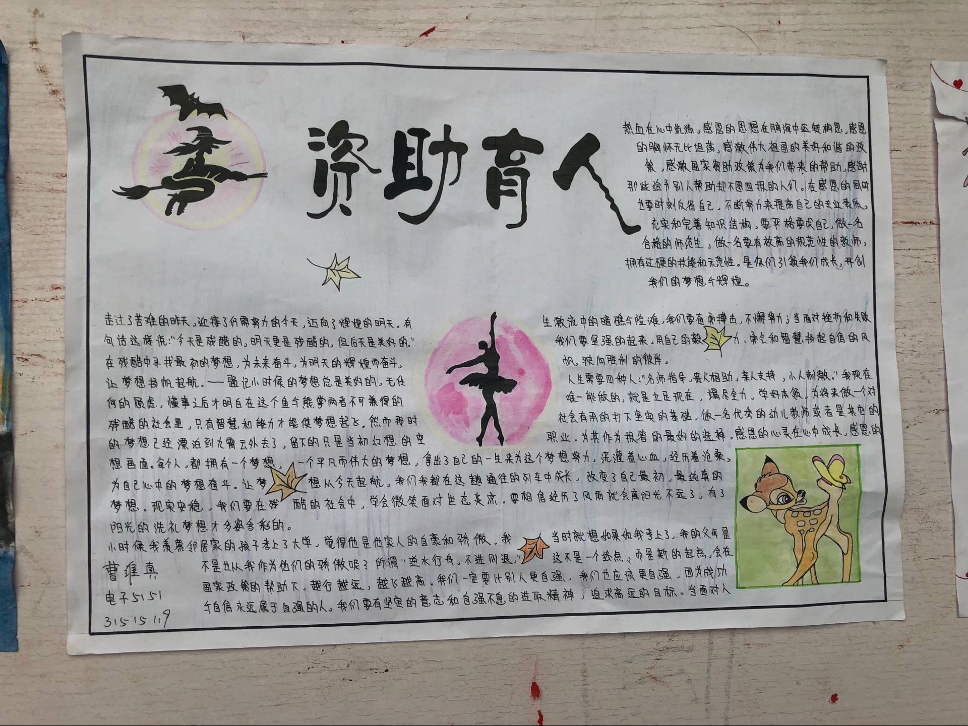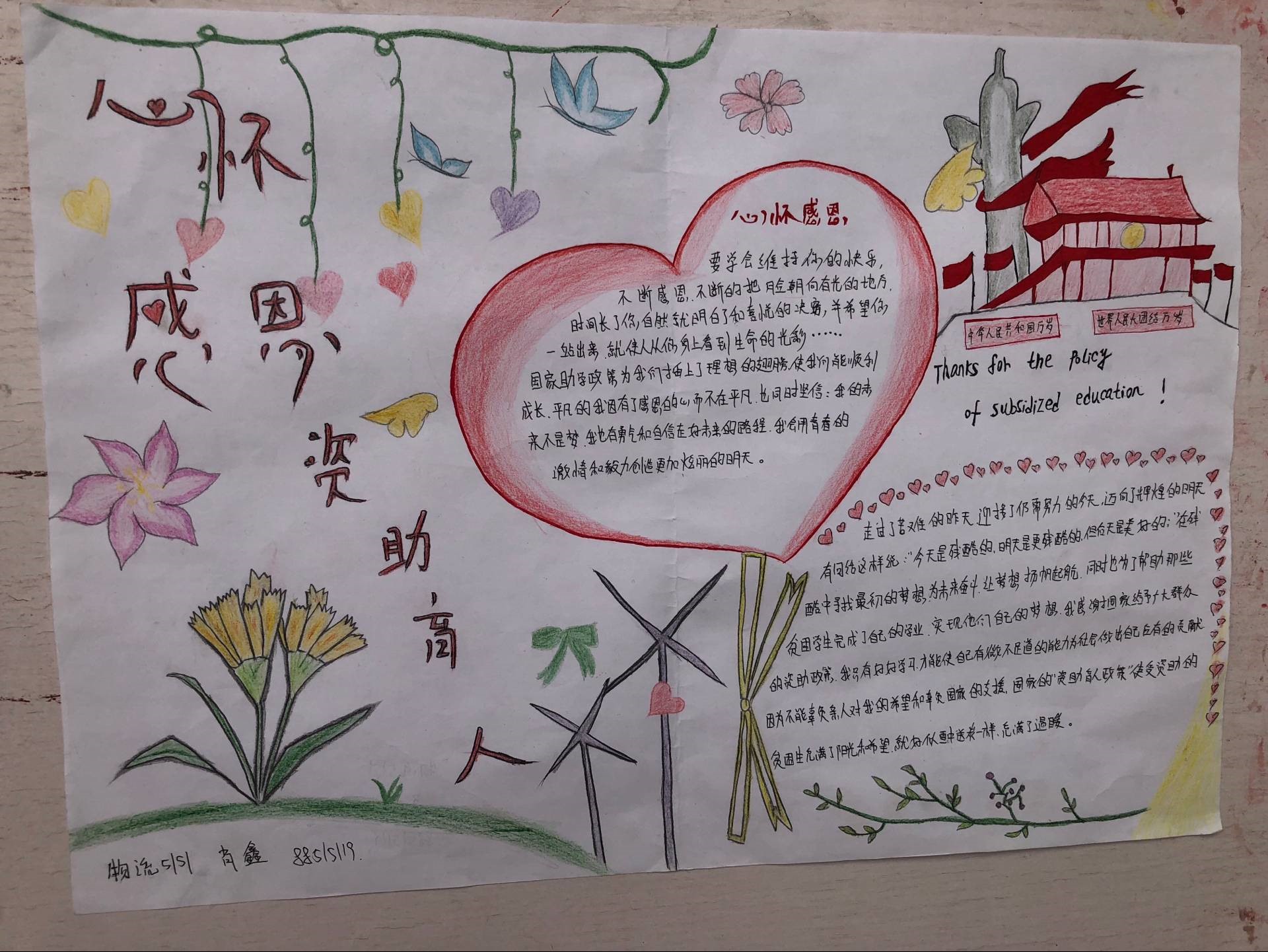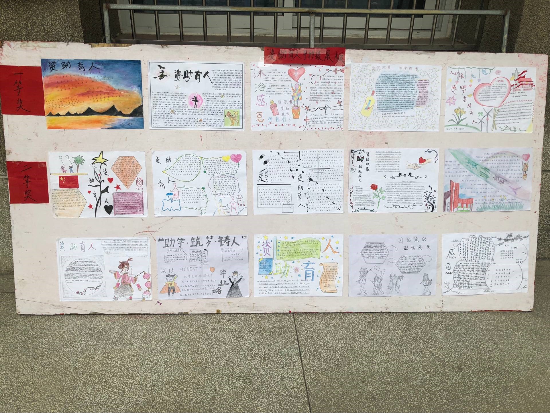 本次活动,基础课部共计100余名同学,其中包括受资助的82名同学均制作了手抄报。大家制作的手抄报不仅内容丰富,感情真挚,而且图画也是精美绝伦,令人赏心悦目,展示了同学们杰出的文采和精湛的画工。大家希望通过自己的心声来感恩国家,感恩社会,感恩学校!比赛最后评选出一等奖五名,二等奖十名,三等奖十五名,获奖作品于一号教学楼前进行展示。