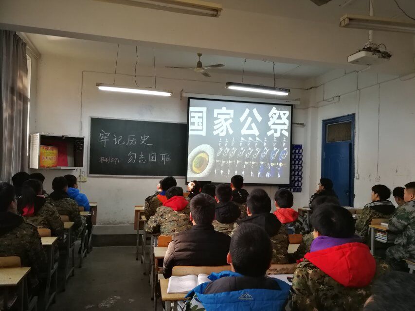 基础课部全体师生没有忘记这永久的沉痛记忆,2018年12月13日基础课部各班级通过开展主题班会,组织团日活动等形式来纪念这一天。同学们着装郑重,表情凝重,在小树林朗诵《南京和平宣言》,告慰为争取民族解放英勇献身的英烈们,观看影片《南京1937》,缅怀“南京大屠杀”遇难同胞,最后全体师生原地默哀一分钟。