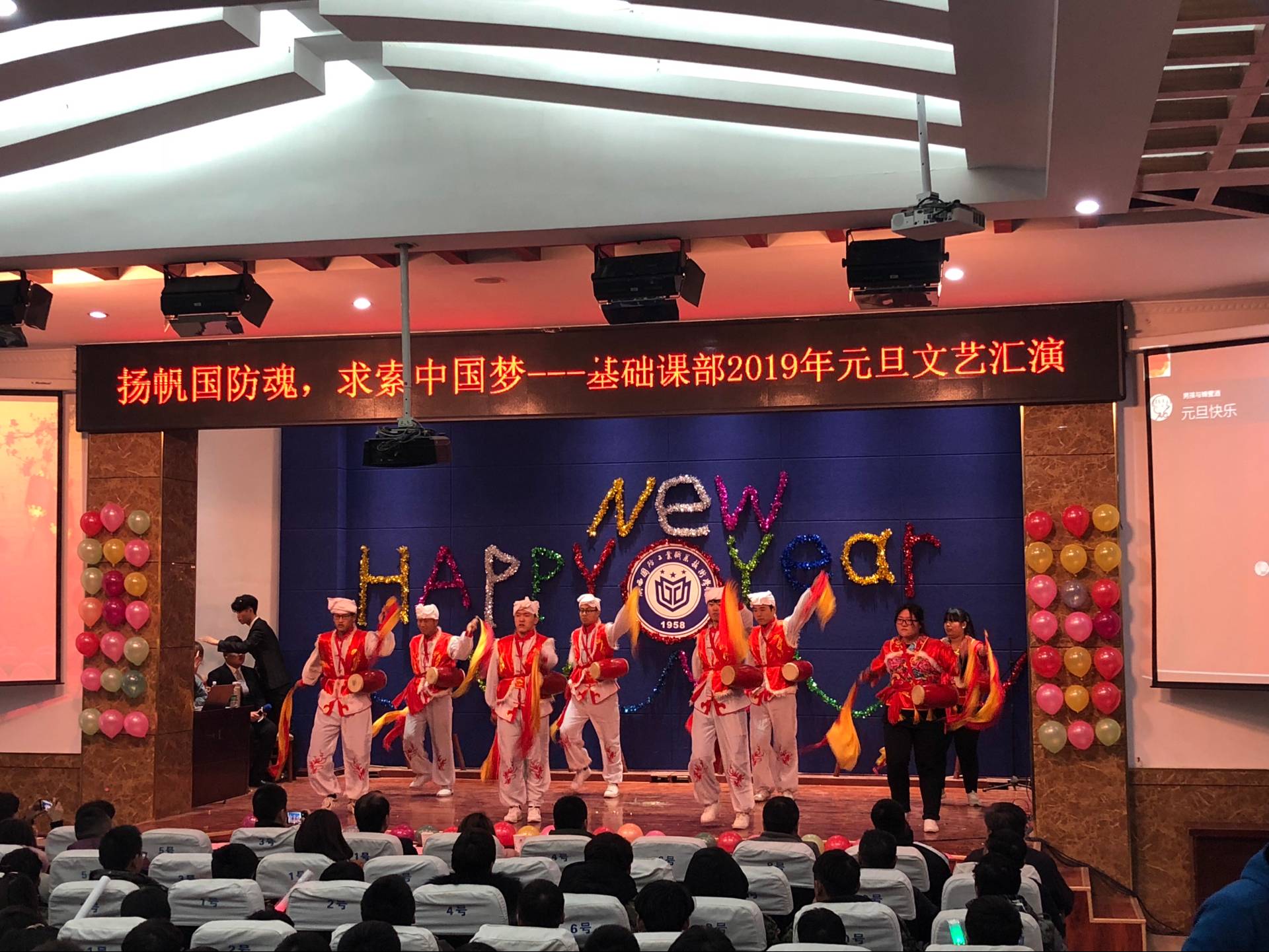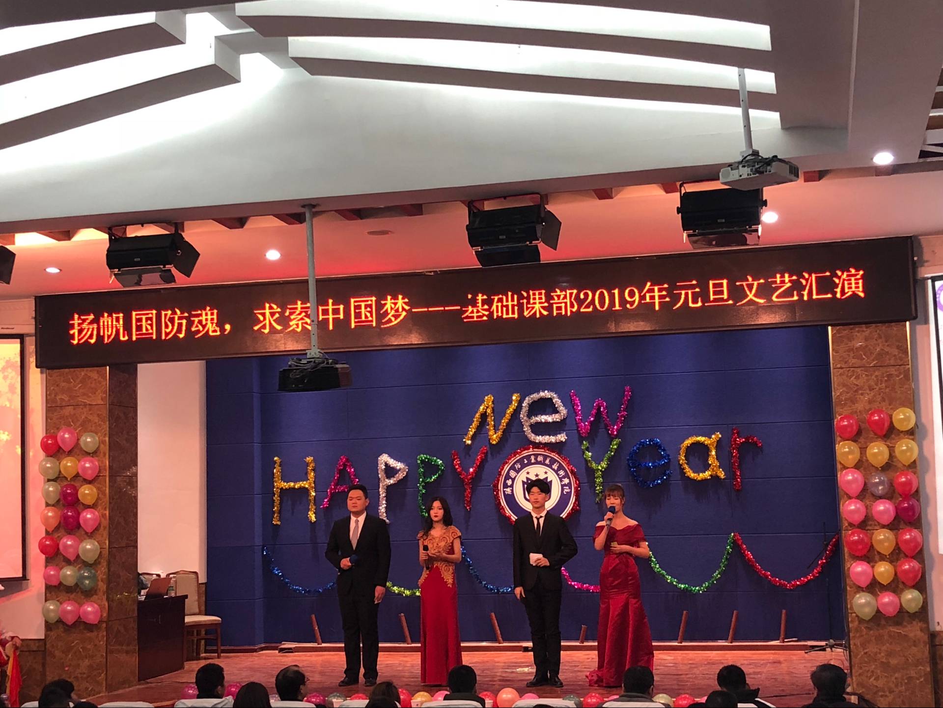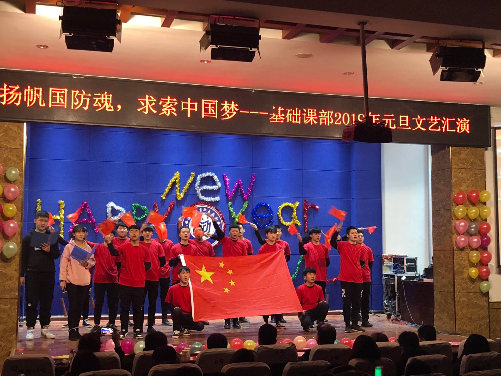 2018年12月25日16:30,基础课部在南区报告厅举办“扬帆国防魂,求索中国梦”2019年元旦文艺汇演,出席本次汇演的嘉宾有基础课党总支书记吴玮玮老师,院团委干事范爽老师,基础课部学生科科长杨论老师,全体辅导员老师、教官以及三百余名同学。