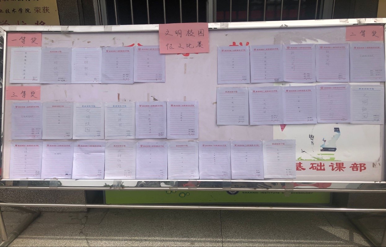 各班学生通过围绕环境保护,文明上网,文明就餐,共建宿舍和班级和谐等方面,倡议大家形成良好的行为习惯,传播文明校园理念,用实际行动参与到创建“文明校园”活动中来。征文活动共计收集学生作品60余篇,最后评选出一等奖5名,二等奖10名,三等奖15名,获奖作品在一号教学楼前展出。