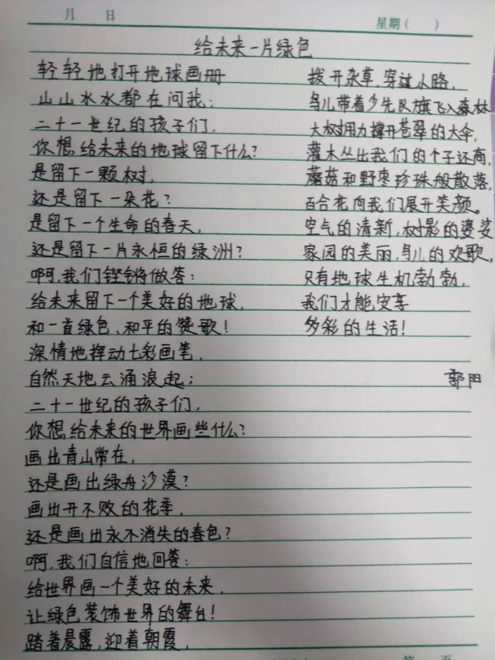 今年我国世界环境日的宣传主题是“美丽中国,我是行动者”,旨在动员社会各界积极参与到生态环境保护实践中来,共同打赢污染防治攻坚战。基础课部呼吁同学们动员你周围的人,一起动手保护我们共同的家园。同学们或以实际行动或以诗歌等以自己的行动大家倡导在日常生活中注意节能减排、减少污染,养成绿色和谐的新生活方式。少使用一次性餐具,少扔垃圾,保护环境,给大家没营造一个良好的生活学习环境。
