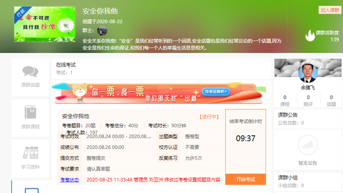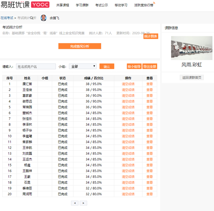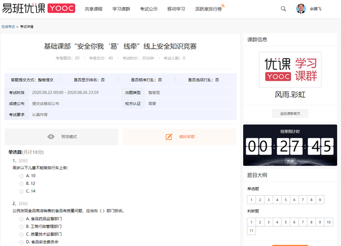基础课部辅导员在易班优课平台上创建课群,将学生日常安全和疫情防控知识以试卷答题的方式让学生进行答题,以此来加强学生安全知识学习。充分利用本次知识竞赛向学生进一步普及和宣传安全教育知识,使学生深入了解安全教育的重要性,真正增强大学生的安全意识和自我保护能力。