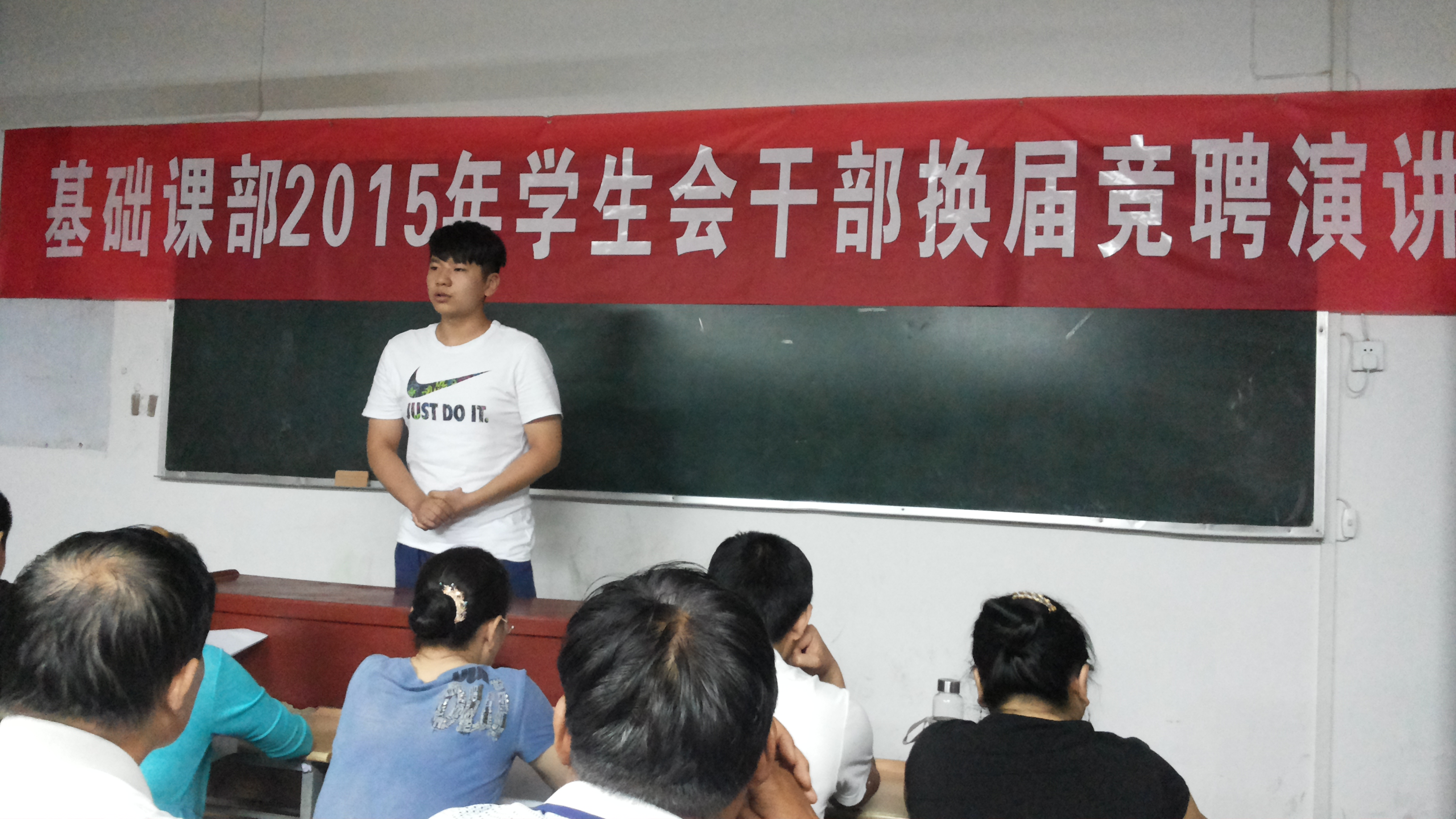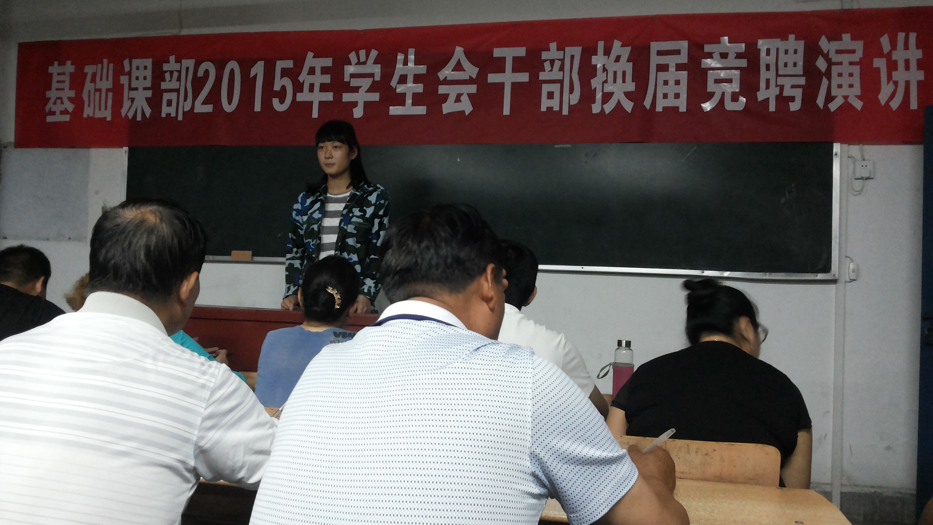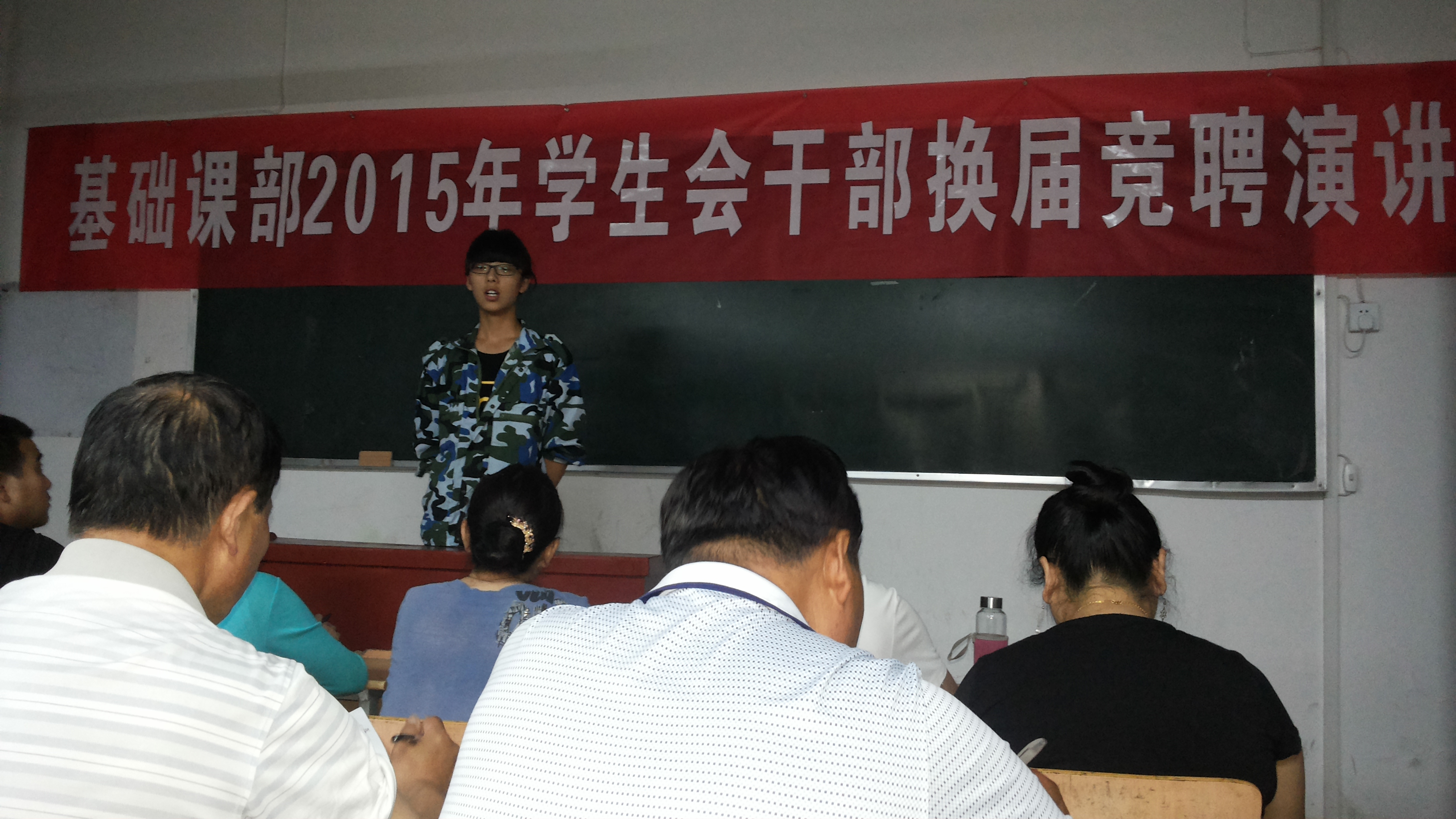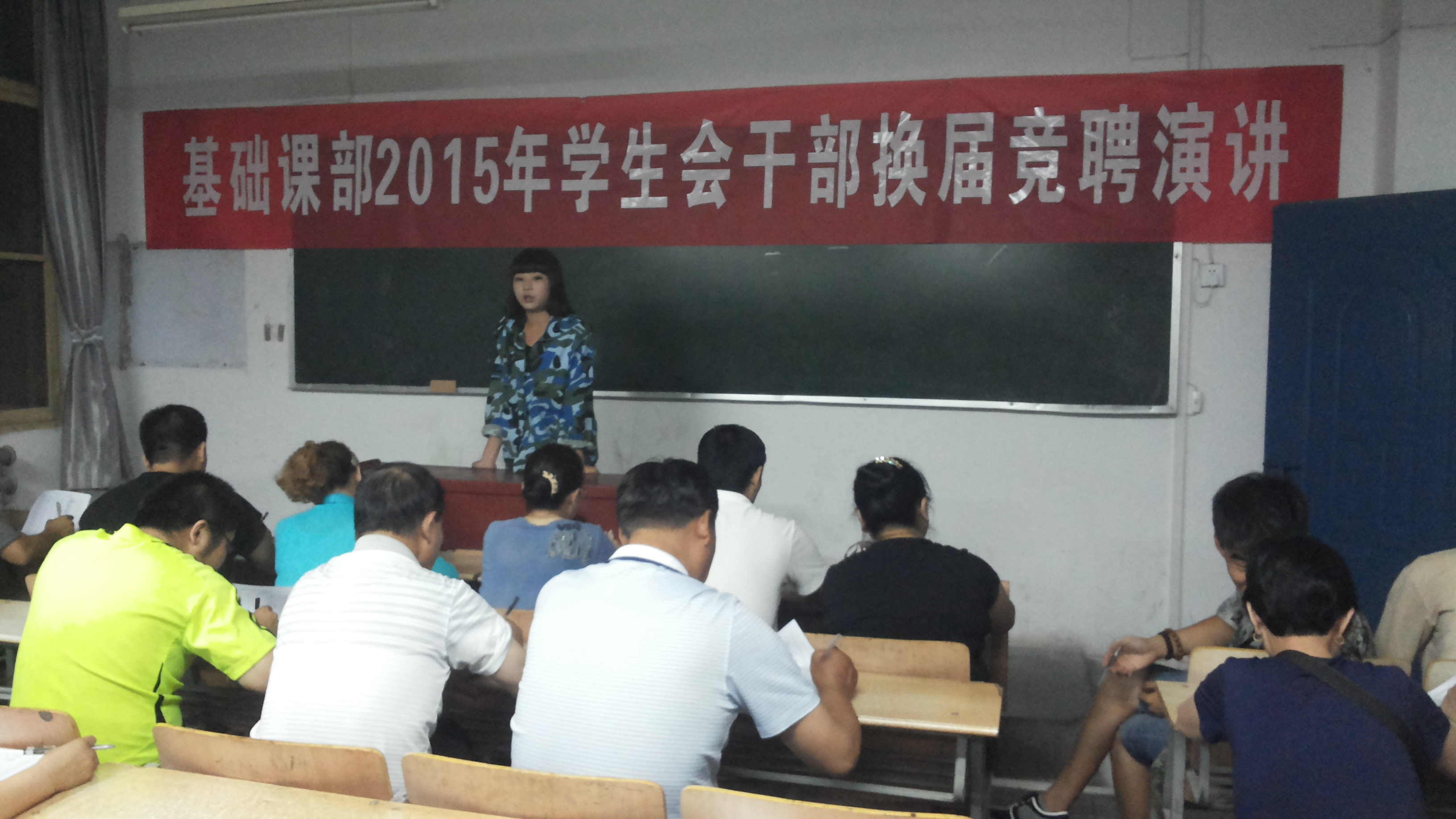 2015年6月17日晚上,经过长期的准备,基础课部新利体育官方网站办公室组织了第五届学生会干部换届工作大会,会议由刘娟老师主持。基础课总支书记杨文革老师对竞聘学生做了鼓励动员讲话并提出要求。教官和辅导员担任评委,所有第四届学生会部长和主席、团总支副书记参与。评委对每位竞聘者进行打分,参考各部门部长和教官的推荐,最终确认了基础课部第五届学生会干部成员。