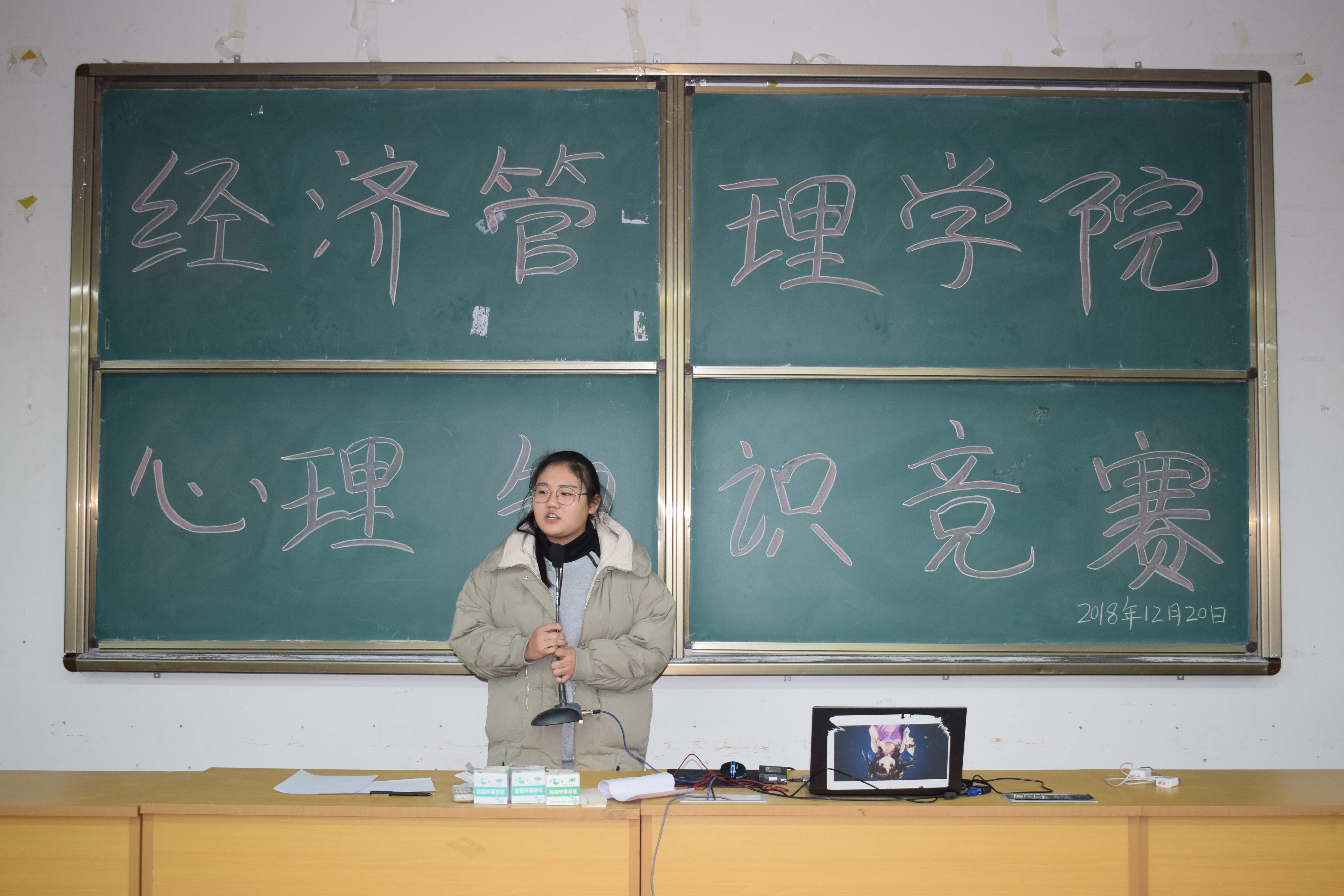 为了普及大学生心理知识以及拓展视野,丰富课余时间,增进彼此之间的友谊。经济管理学院于2018年12月20日19:30分在3-233教室举行“心之约,梦之翼”心理健康知识竞赛。本次心理知识竞赛不仅丰富同学们的课余生活,同时开阔了同学们的视野,也让更多的学生在活动中了解心理健康知识,从而认识自我,提升自我。