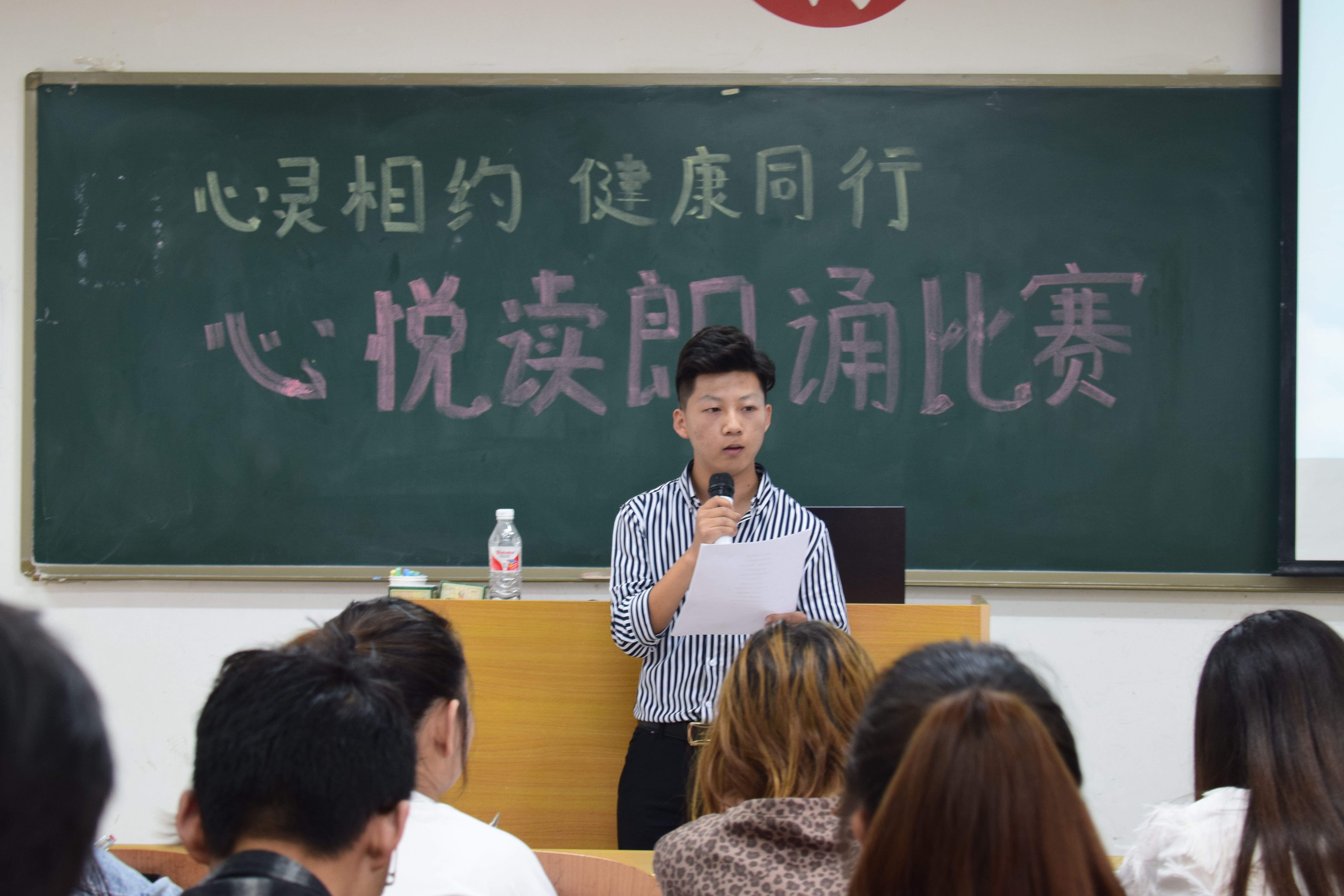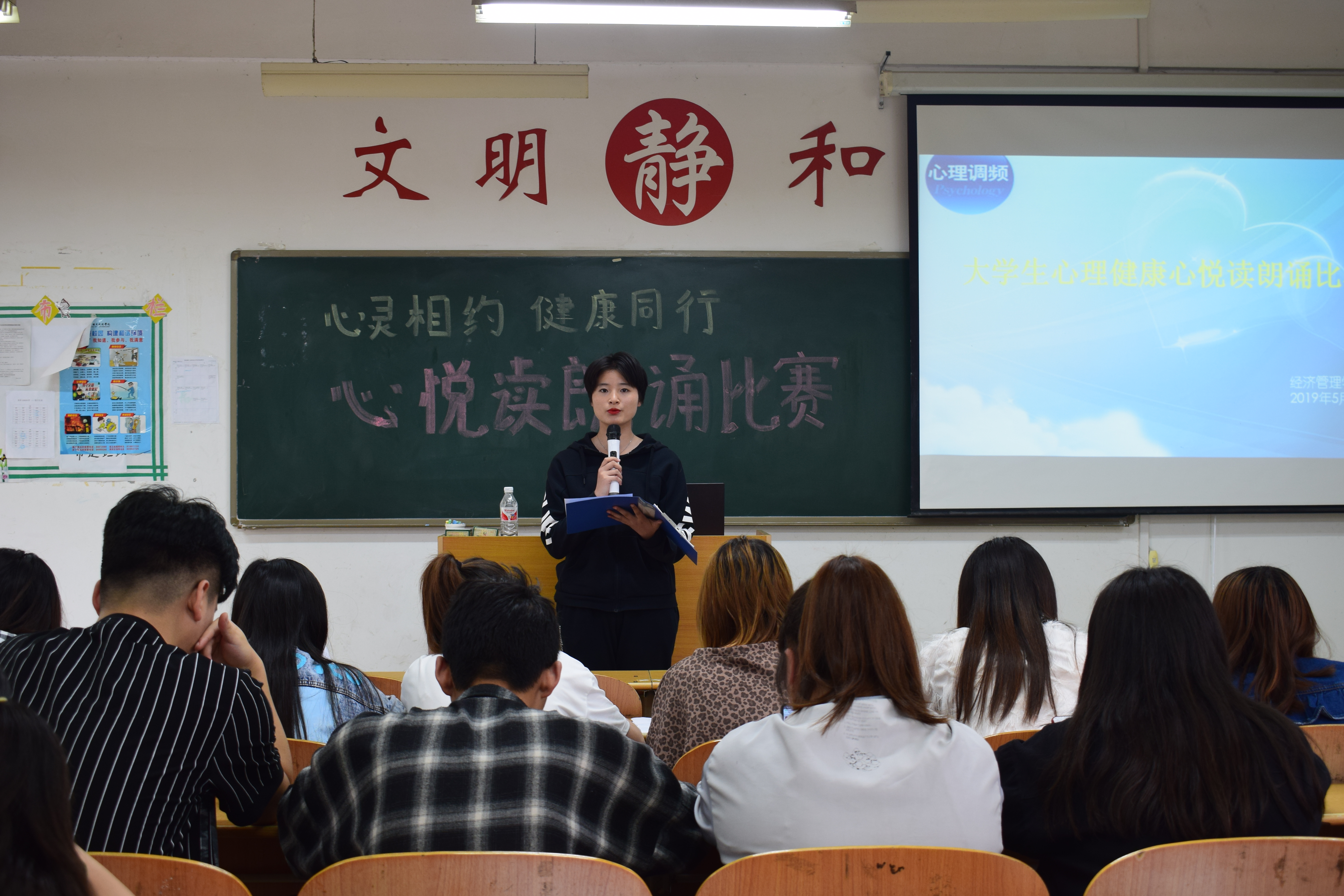 为了进一步提高同学们参与心理健康教育的主动性和积极性,促进心理健康知识在校园的传播,丰富大学校园心理健康教育的内容,创新心理健康教育的形式,经济管理学院于2019年4月29日在3-110教室举行“心灵相约,健康同行”心理健康主题朗诵比赛。