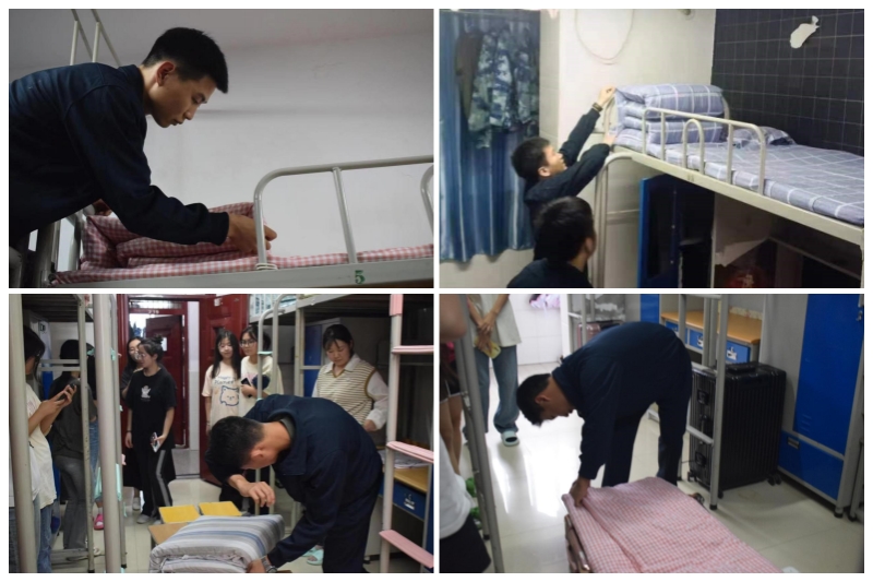 9月11日下午四点三十分,教官和老师带领各班班长来到学员寝室,亲自示范如何叠被子、挂毛巾、摆放物品等操作,向学员讲述内务整理的技巧。对于军训标志性“豆腐块”被子的操作要领,同学们认真观察教官的示范动作,并反复练习。运用“压、折、挤、掏”等基本动作完成从棉被到“豆腐块”的进步。接着教官对卫生区洗漱用品的摆放提出整改要求,学员积极配合重新布置摆放。