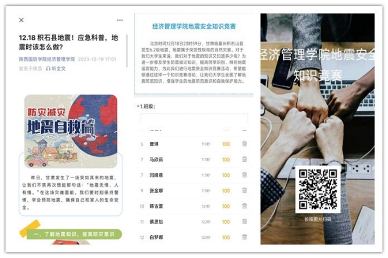 为进一步普及学生防震减灾知识,让学生们全面了解地震防范知识和自我保护能力。经济管理学院于12月19日-12月26日举办了地震安全知识竞赛活动。