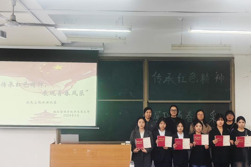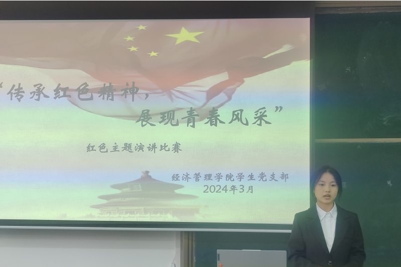 2024年03月25日下午四点,经济管理学院学生党支部举办了一场以“传承红色精神,展现青春风采”为主题的红色演讲比赛。本次比赛吸引了众多选手参与,她们用激情洋溢的演讲,抒发了对红色精神的敬仰和对青春的热爱。