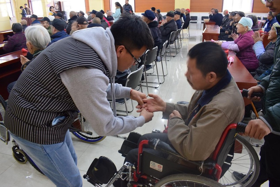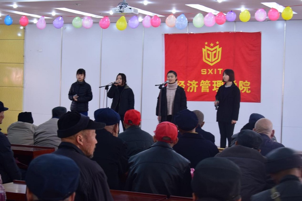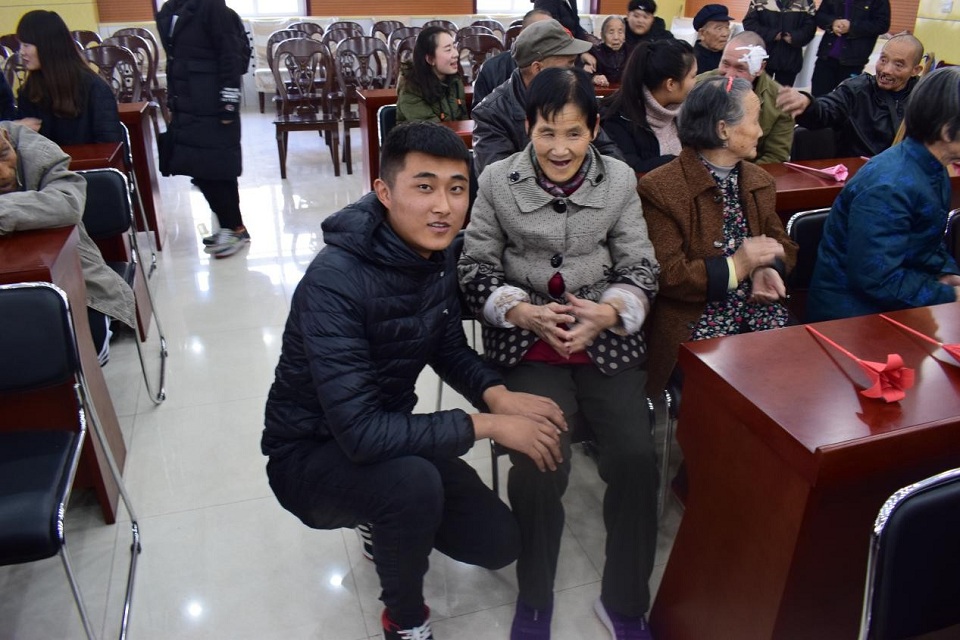 中心养老院的老人大多数是村里困难户,年纪较大且无人照顾,在这里互相照应。上午8点10分到达养老院后,养老院负责人带领大家来到老人的住所,同学们分成多组搀扶100多名老人来到活动场所。首先为老人献上自己亲手所折的百合花,每朵花上写满了同学们对老人的祝福,接下来为老人献上精心准备的节目,《感恩的心》勾起人性善根、《拍拍操》活起胫骨脉络,《最美不过夕阳红》说出心灵的佳话,全场掌声不断,结束后同学们纷纷坐到老人身边,拉着老人的手和老人聊天、给老人捶腿和按摩,看着老人慈祥的笑容,时间仿佛静止了,这一刻所有的老人忘记了孤独,感受到了陪伴的快乐。
