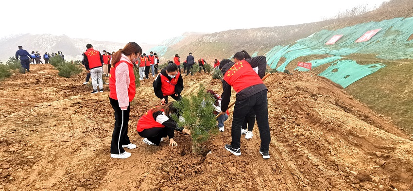 活动结束后,全体志愿者在黄柏峪建筑石料矿1号顶开展绿色文明迎全运 生态卫士“鄠”秦岭义务植树活动。师生志愿者领取树苗和铁锨、水桶等劳动工具后,在现场技术人员的讲解下,有序开展植树劳动。扶苗、培土、围堰、浇灌,植树现场一片热火朝天的景象。大家把植树的每道工序一丝不苟的进行,一人挖土刨坑、一人扶苗,多人夯土,合力种下树苗,配合十分默契。经过一个多小时的合作,树苗全部栽种完成。