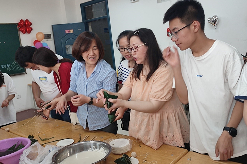 首先由主持人介绍本次活动的相关流程,辅导员老师分组带领学生开展包粽子趣味比赛,并讲解传统节日端午节的来历。