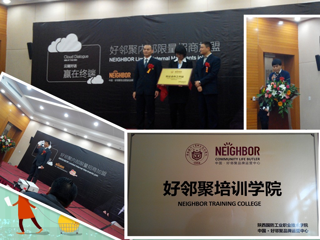 2014年11月22日好邻聚运营中心在西安市曲江国际会议中心举行好邻聚品牌推介会,邀请我校刘敏涵副院长、实践教学管理处与校企合作处侯晓方处长、招生就业处吴君良处长、经济管理学院王占祥院长参会。会上好邻聚运营中心向经济管理学院王占祥院长授予“好邻聚培训学院”牌,我校侯晓方处长向好邻聚运营中心授予“校企合作工作站”牌。同时,刘敏涵副院长发表了热情洋溢的致辞,吴君良处长作了诗词朗诵以示庆贺。