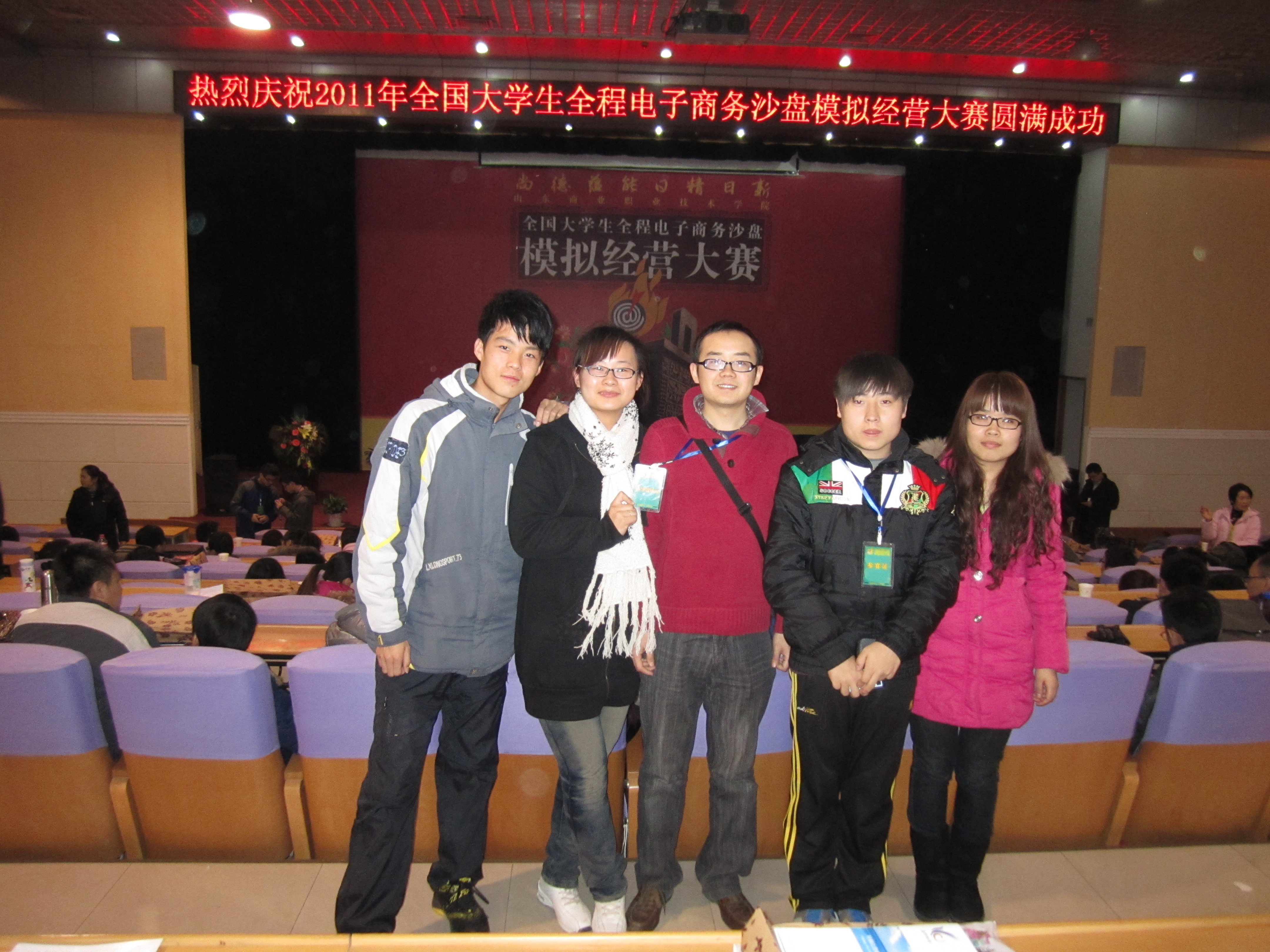 2011年12月24日,我院连锁经营管理专业的张平、刘莹、许浩轩同学和电子商务专业的张雷同学代表学院参加了由教育部高等学校高职高专工商管理类专业教指委主办、山东商业职业技术学院承办的“2011年全国大学生全程电子商务沙盘模拟经营大赛”全国总决赛,并获得三等奖。