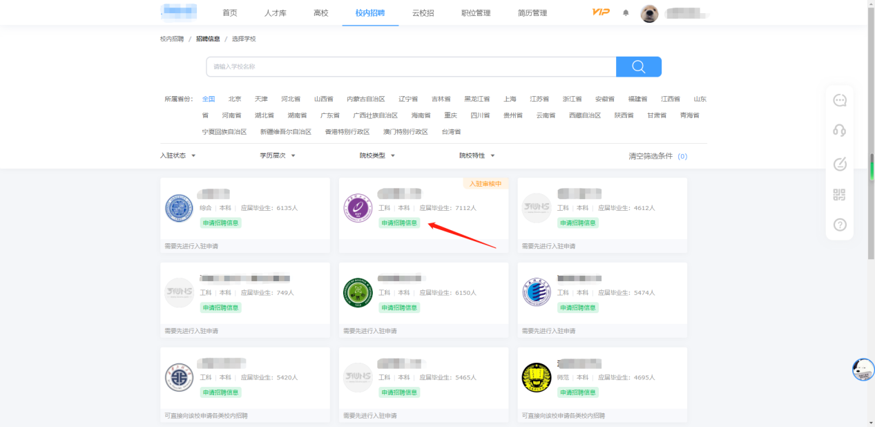 (三)找到学校后,点击“申请招聘信息”。