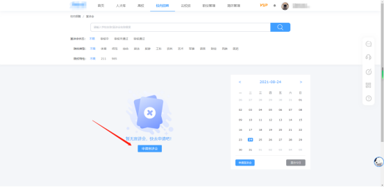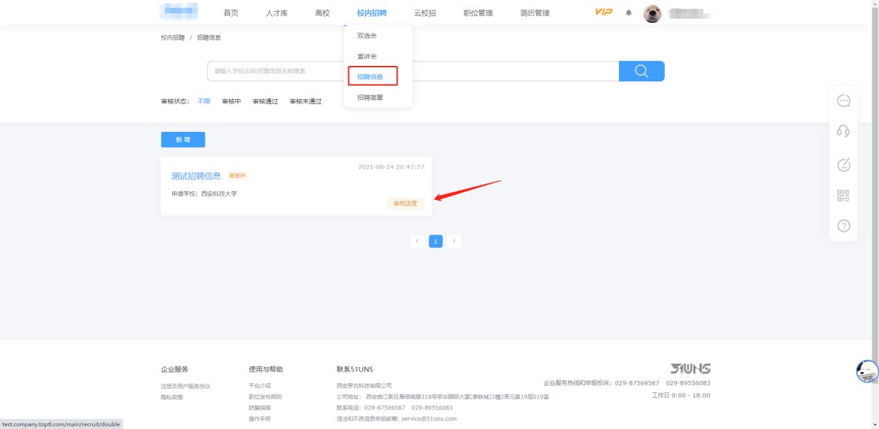 (六)完成在线预约后,可点击顶部导航栏的“校内招聘”-“宣讲会”,再点击对应预约记录的“查看进度”来查询学校审核进度。