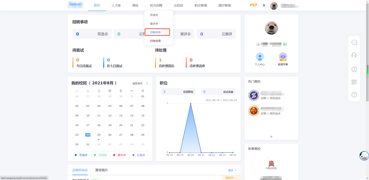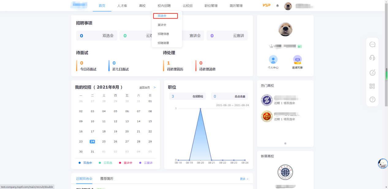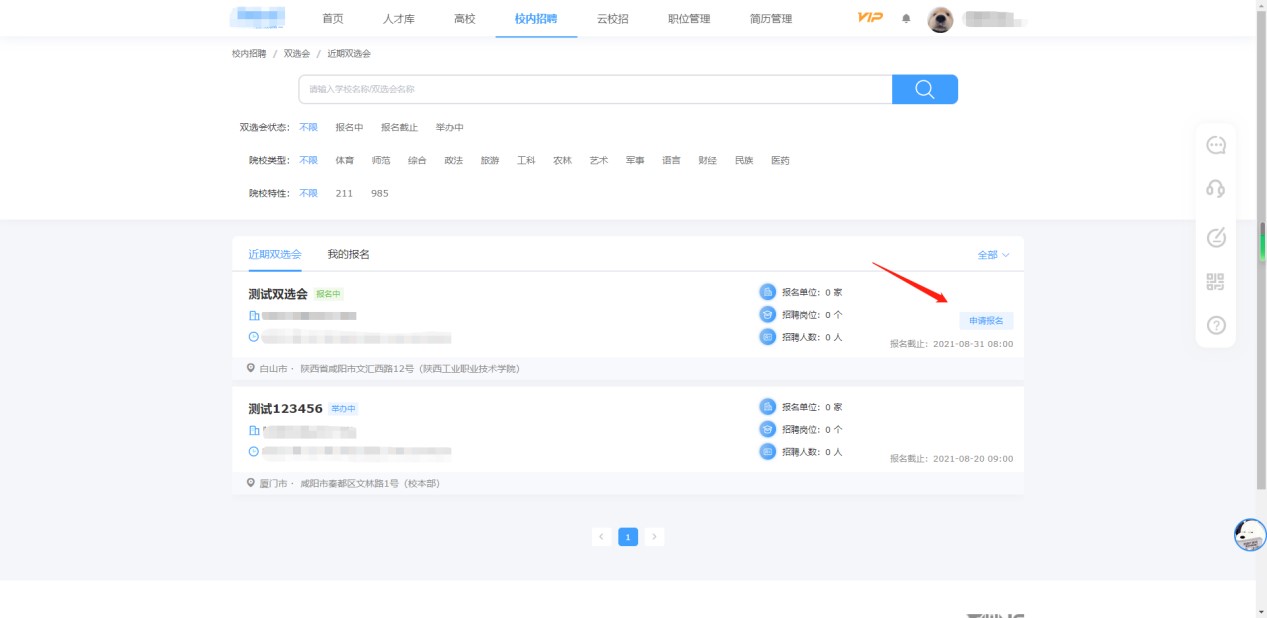 (一)登录后点击顶部导航栏的“校内招聘”,再点击弹出来的“双选会”。