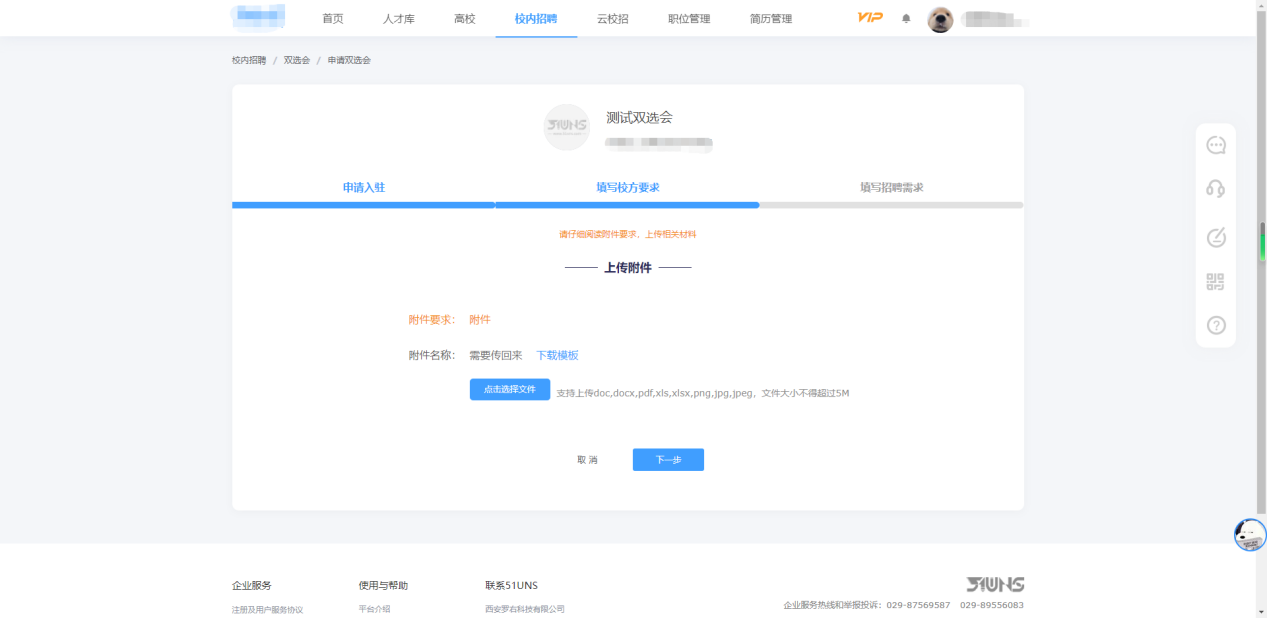 (三)根据学校要求,填写双选会报名表并上传相应附件。(点击“下载模板”下载学校要求用人单位填写的附件模板,红色字体为学校要求,请用人单位认真阅读)