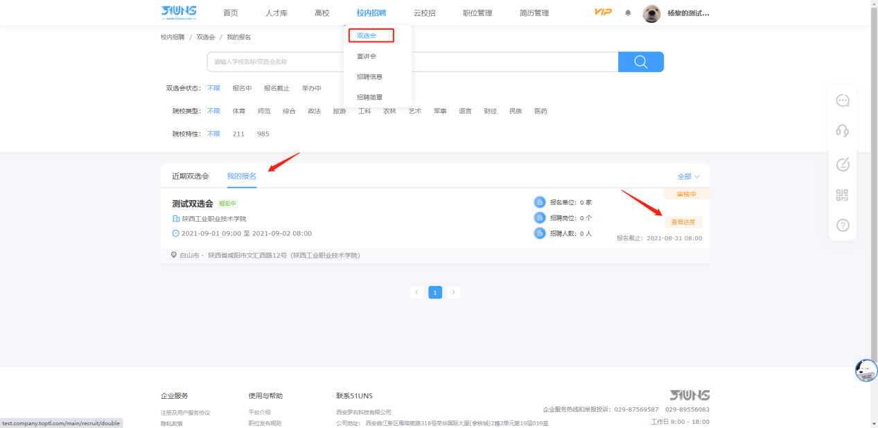(四)完成在线报名后,可点击顶部导航栏的“校内招聘”-“双选会”,点击“我的报名”,再点击“查看进度”来查询学校审核进度。