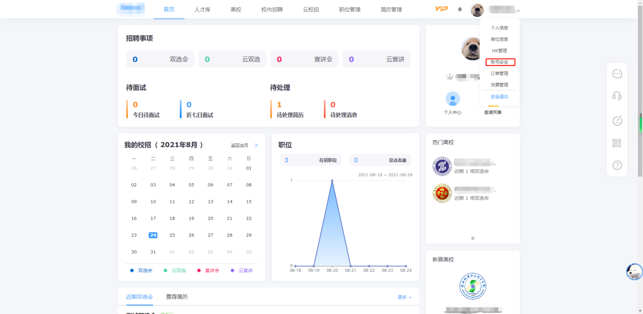 1、登录后在首页点击右上角的单位名称,再点击弹出的“账号安全”。
