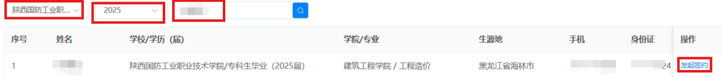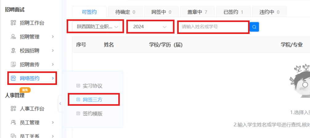 点击“可签约学生”,输入学生姓名或学号进行查找,核对学院专业等信息正确后发起网签。