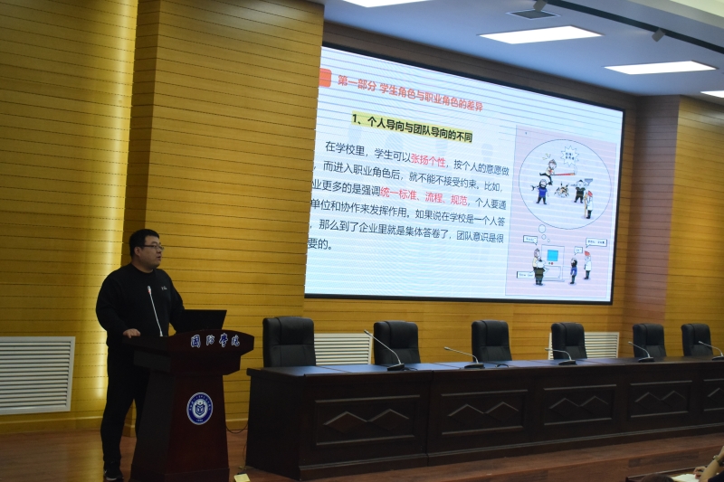 首先,由闫应召老师做《角色转变与适应——迈好走向社会的第一步》讲座。讲座从学生角色与职业角色的差异,角色转变的心理准备,角色意识和期望的确立,生活、心理、环境、文化、人际关系处理等角色适应方面向学生进行介绍,让学生在人生新的阶段,不断完善和充实自己,彻底完成角色转变。并向学生提出立足本职工作的同时,不断学习,建立和谐人际关系,提高沟通交往能力等建议,鼓励毕业生积极应对就业挑战。