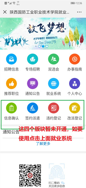 4、目前信息确认、签约派遣、违约登记、改派登记四个版块正在完成微信数据对接,暂不能使用。如要使用相关功能,点击上面就业系统。
