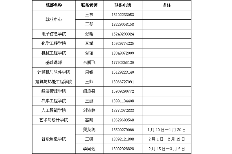 为了方便毕业生在寒假期间办理签约、派遣等就业手续和用人单位联系校园招聘,就业中心和各院部将在寒假期间安排老师继续提供相关业务的咨询服务,如需办理就业相关手续,请先与所在分院的老师预约联系进行咨询,沟通好时间后,再进行办理。具体名单如下: