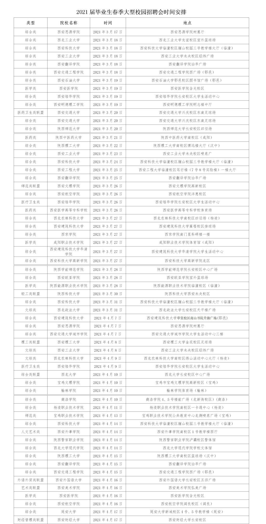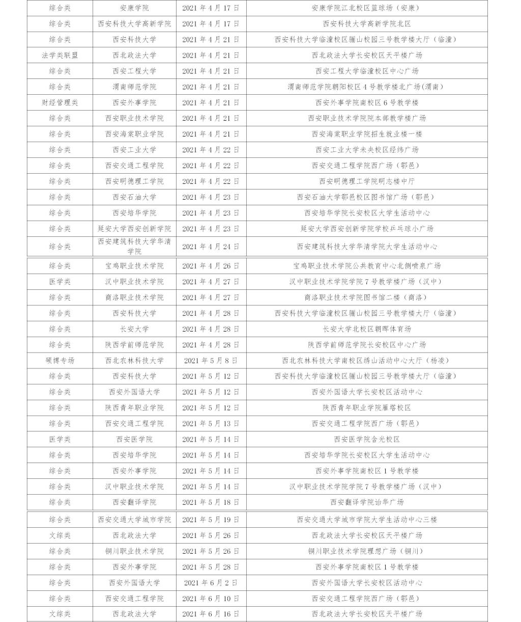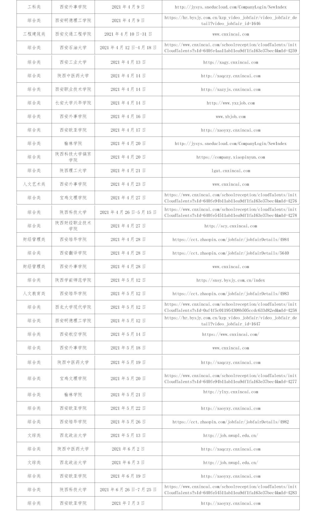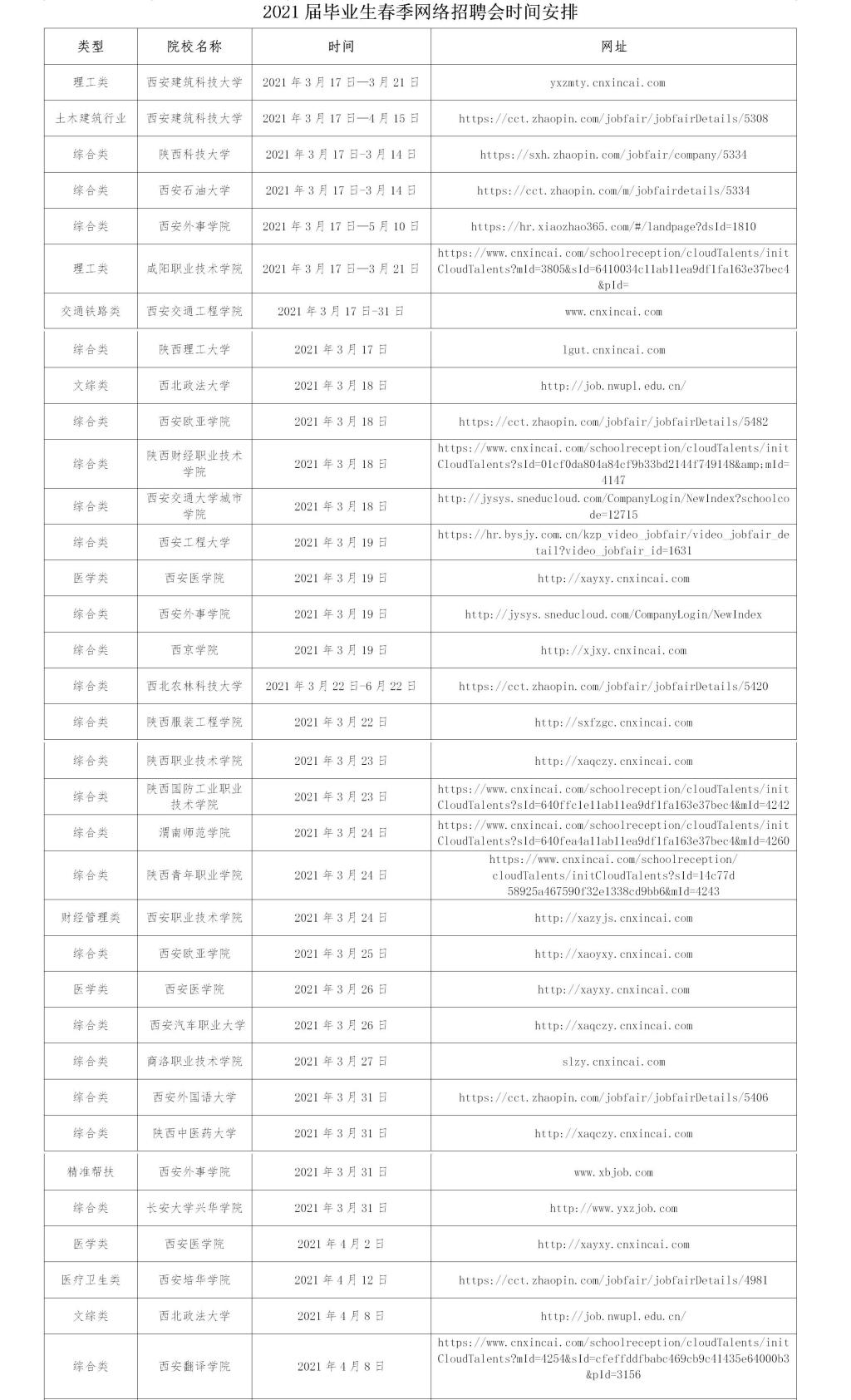 省教育厅和各高校还将陆续举办各类联盟招聘会、中小型和专场校园招聘会,相关信息请关注陕西省教育厅网站(http://jyt.shaanxi.gov.cn)、陕西省高等学校毕业生就业服务中心网站(http://jyweb.sneducloud.com)和各院校官方网站。