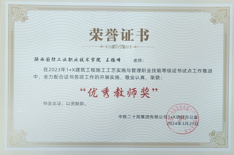 在本次会议上对1+X建筑工程施工工艺实施与管理职业技能等级证书2023年度优秀单位及个人进行了表彰,我校建筑工程学院郭晶晶老师代表学院参加了本次表彰会议。我校荣获1+X建筑工程施工工艺实施与管理职业技能等级证书优秀考试点院校奖,王振峰、李广燕两位老师荣获优秀教师奖。在2023年度的试点工作推进中,我校建筑工程学院建筑教研室的王振峰、李广燕、徐明霞等老师们在学院领导的大力支持下,认真贯彻1+X证书制度、统筹协调院校资源、积极组织动员学生,与中铁二十局1+X项目办公室同心协力,校企联动,共同推进证书发展。